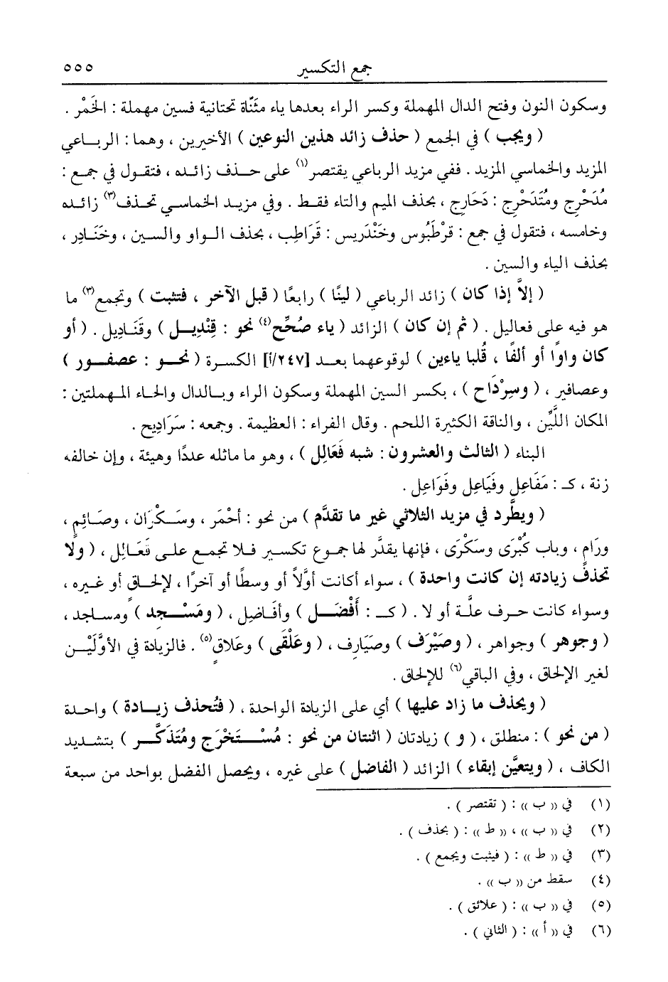 "ويجب" في الجمع "حذف زائد هذين النوعين" الأخيرين. وهما: الرباعي المزيد والخماسي المزيد. ففي مزيد الرباعي يقتصر1 على حذف زائده، فتقول في جمع: مدحرج ومتدحرج: دحارج، بحذف الميم والتاء فقط. وفي مزيد الخماسي تحذف3 زائده وخامسه، فتقول في جمع: قرطبوس وخندريس: قراطب, بحذف الواو والسين، وخنادر، بحذف الياء والسين.