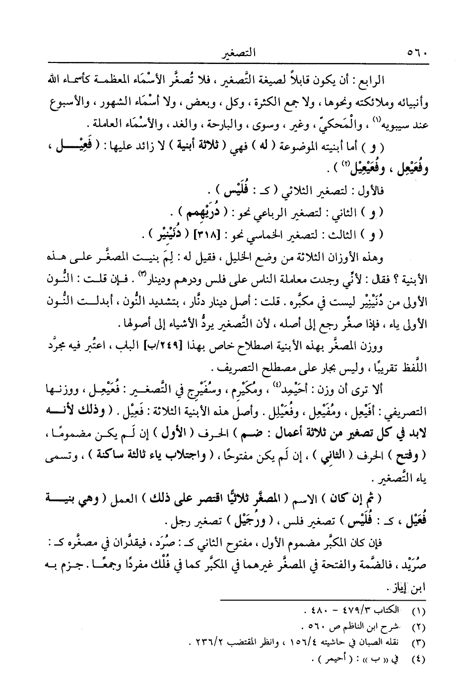 الرابع: أن يكون قابلا لصيغة التصغير، فلا تصغر الأسماء المعظمة كأسماء الله وأنبيائه وملائكته ونحوها، ولا جمع الكثرة، وكل، وبعض، ولا أسماء الشهور، والأسبوع عند سيبويه1، والمحكي، وغير، وسوى، والبارحة، والغد، والأسماء العاملة.
