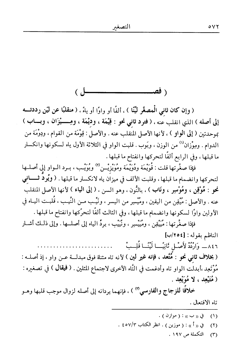 فإذا صغرتها قلت: قويمة ودويمة ومويزين2 وبويب، برد الواو إلى أصلها لتحركها وانضمام ما قبلها، وقلبت الألف في ميزان ياء لانكسار ما قبلها. "ويرد ثاني نحو: موقن، وموسر، وناب", بالنون، وهو السن، "إلى الياء" لأنها الأصل المنقلب عنه. والأصل: ميقن من اليقين، وميسر من اليسر، ونيب من النيب، قلبت الياء في الأولين واوًا لسكونها وانضمام ما قبلها، وفي الثالث ألفًا لتحركها وانفتاح ما قبلها.