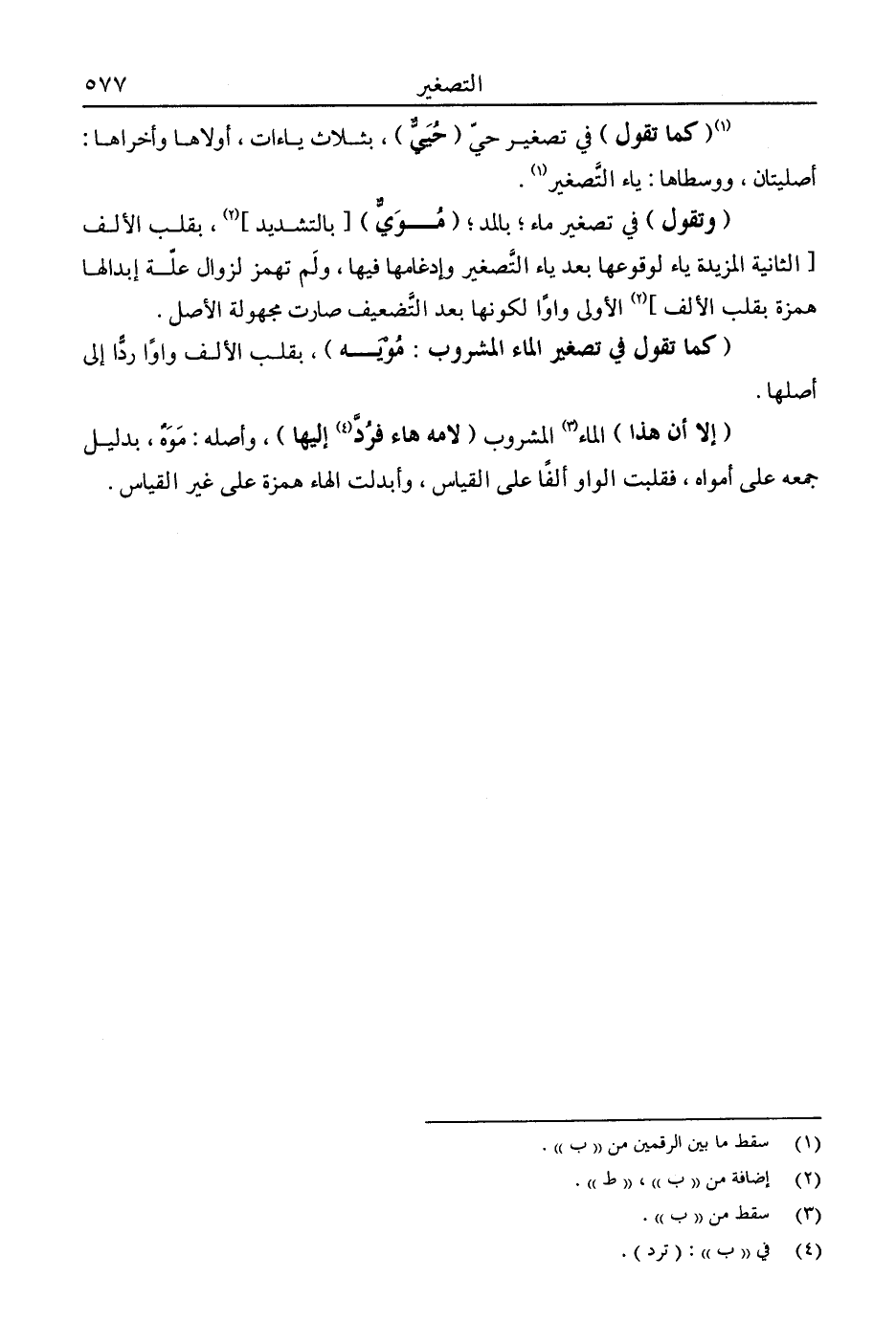"كما تقول في تصغير الماء المشروب، مويه"، بقلب الألف واوًا ردا إلى أصلها.