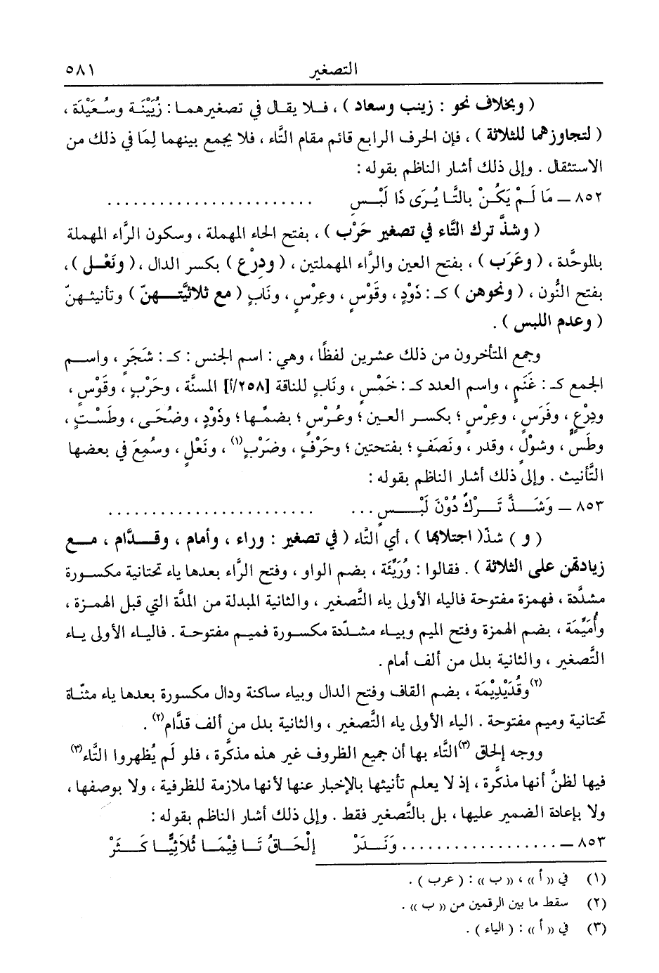 ووجه إلحاق التاء3 بها أن جميع الظروف غير هذه مذكرة، فلو لم يظهروا التاء3 فيها لظن أنها مذكرة، إذ لا يعلم تأنيثها بالإخبار عنها لأنها ملازمة للظرفية، ولا بوصفها، ولا بإعادة الضمير عليها، بل بالتصغير فقط. وإلى ذلك أشار الناظم بقوله: