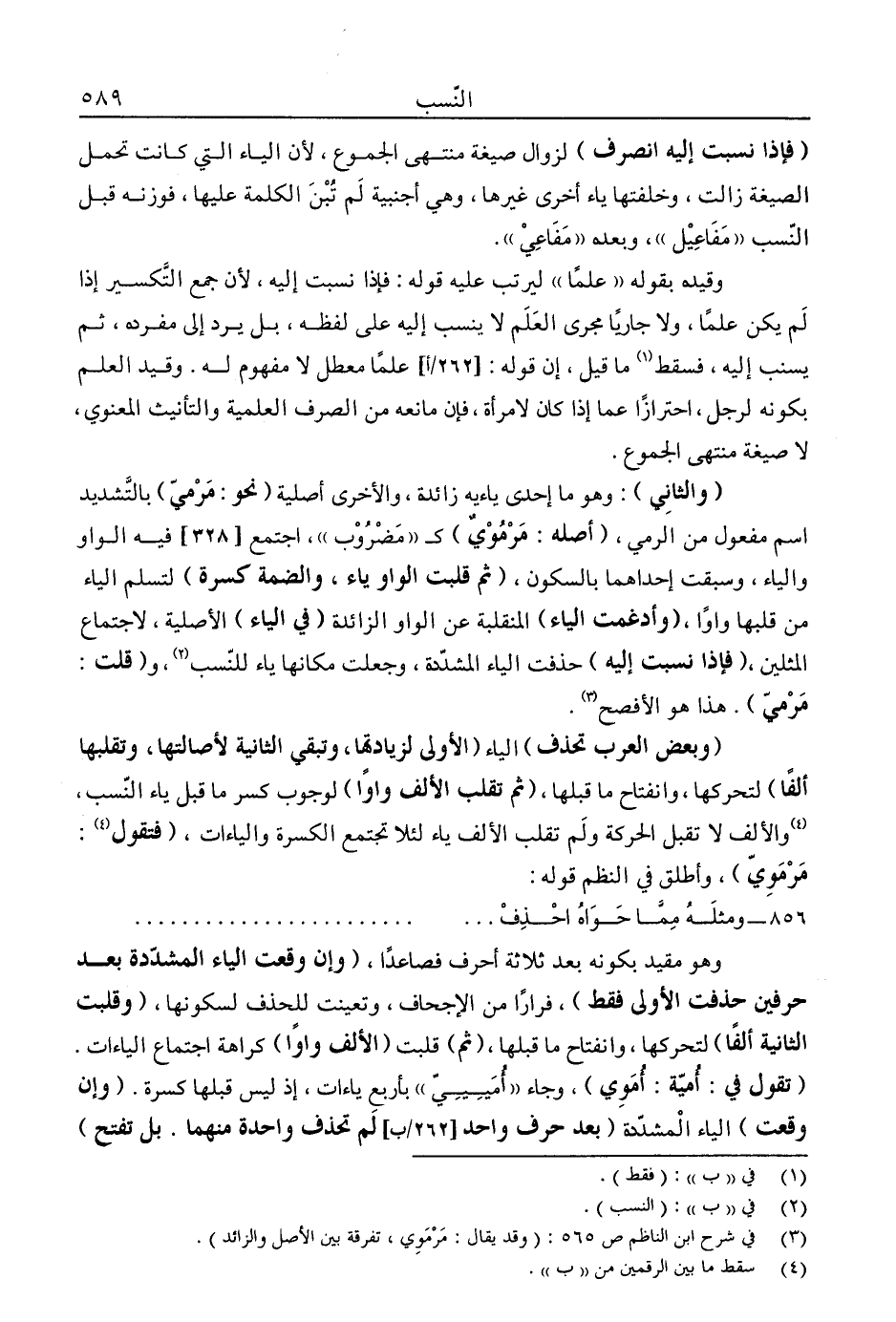 "وبعض العرب تحذف" الياء "الأولى لزيادتها، وتبقي الثانية لأصالتها، وتقلبها ألفًا" لتحركها، وانفتاح ما قبلها، "ثم تقلب الألف واوًا" لوجوب كسر ما قبل ياء النسب، [والألف لا تقبل الحركة ولم تقلب الألف ياء لئلا تجتمع الكسرة والياءات. "فتقول] 4: مرموي"، وأطلق في النظم قوله: