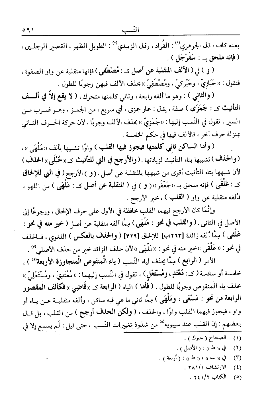 الأمر "الرابع" مما يحذف لياء النسب "ياء المنقوص المتجاوزة الأربعة"4، خامسة أو سادسة "كـ: معتد، ومستعل"، تقول في النسب إليهما: "معتدي، ومستعلي" بحذف ياء المنقوص وجوبًا للطول. "فأما" الياء "الرابعة كـ: "قاضي" فكألف المقصور الرابعة من نحو: مسعى، وملهى" مما ثاني ما هي فيه ساكن، وألفه منقلبة عن ياء أو واو، فيجوز فيها القلب واوًا، والحذف "ولكن الحذف أرجح" من القلب، بل قال بعضهم: إن القلب عن سيبويه5 من شذوذ تغيرات النسب، حتى قيل: لم يسمع إلا في