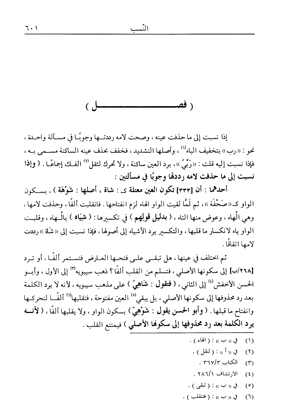 أحدهما: أن تكون العين معتلة كـ: شاة، أصلها، شوهة"، بسكون الواو كـ: صحفة"، ثم لما لقيت الواو الهاء لزم انفتاحها. فانقلبت ألفًا. وحذفت لامها وهي الهاء وعوض منها التاء "بدليل قولهم" في تكسيرها: "شياه" بالهاء. وقلبت الواو ياء لانكسار ما قبلها، والتكسير يرد الأشياء إلى أصولها، فإذا نسبت إلى "شاة" رددت لامها اتفاقًا.