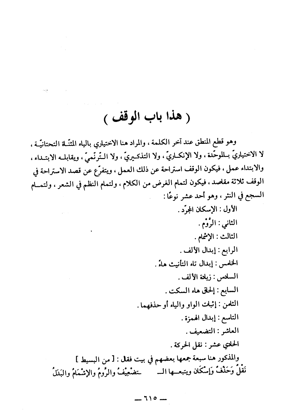 وهو قطع المنطق عند آخر الكلمة، والمراد هنا الاختياري بالياء المثناة التحتانية، لا الاختياري بالموحدة، ولا الإنكاري، ولا التذكيري، ولا الترنمي، ويقابله الابتداء والابتداء عمل، فيكون الوقف استراحة عن ذلك العمل، ويتفرع عن قصد الاستراحة في الوقف ثلاثة مقاصد، فيكون لتمام الغرض من الكلام، ولتمام النظم في الشعر، ولتمام السجع في النثر، وهو أحد عشر نوعًا: