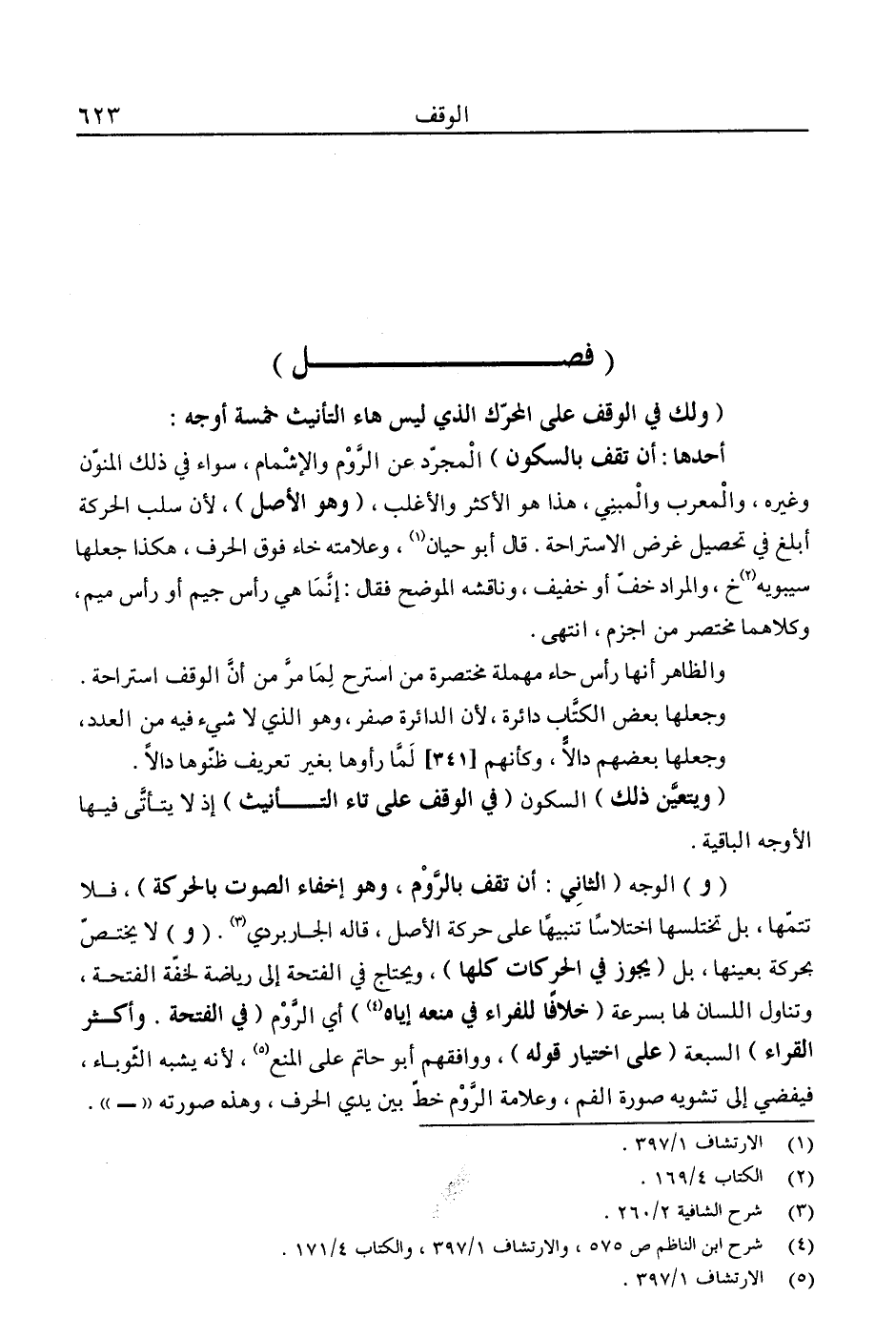 "ولك في الوقف على المحرك الذي ليس هاء التأنيث خمسة أوجه: