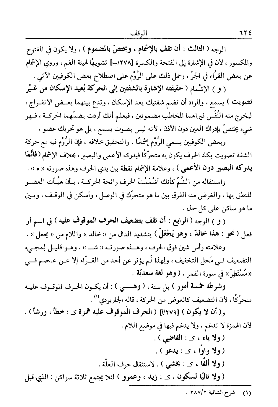 وبعض الكوفيين يسمي الروم إشمامًا، والتحقيق خلافه، فإن الروم مع حركة الشفة تصويت يكاد الحرف يكون به متحركًا فيدركه الأعمى والبصير، بخلاف الإشمام "فإنما يدركه البصير دون الأعمى"، وعلامة الإشمام نقطة بين يدي الحرف وهذه صورته ".".