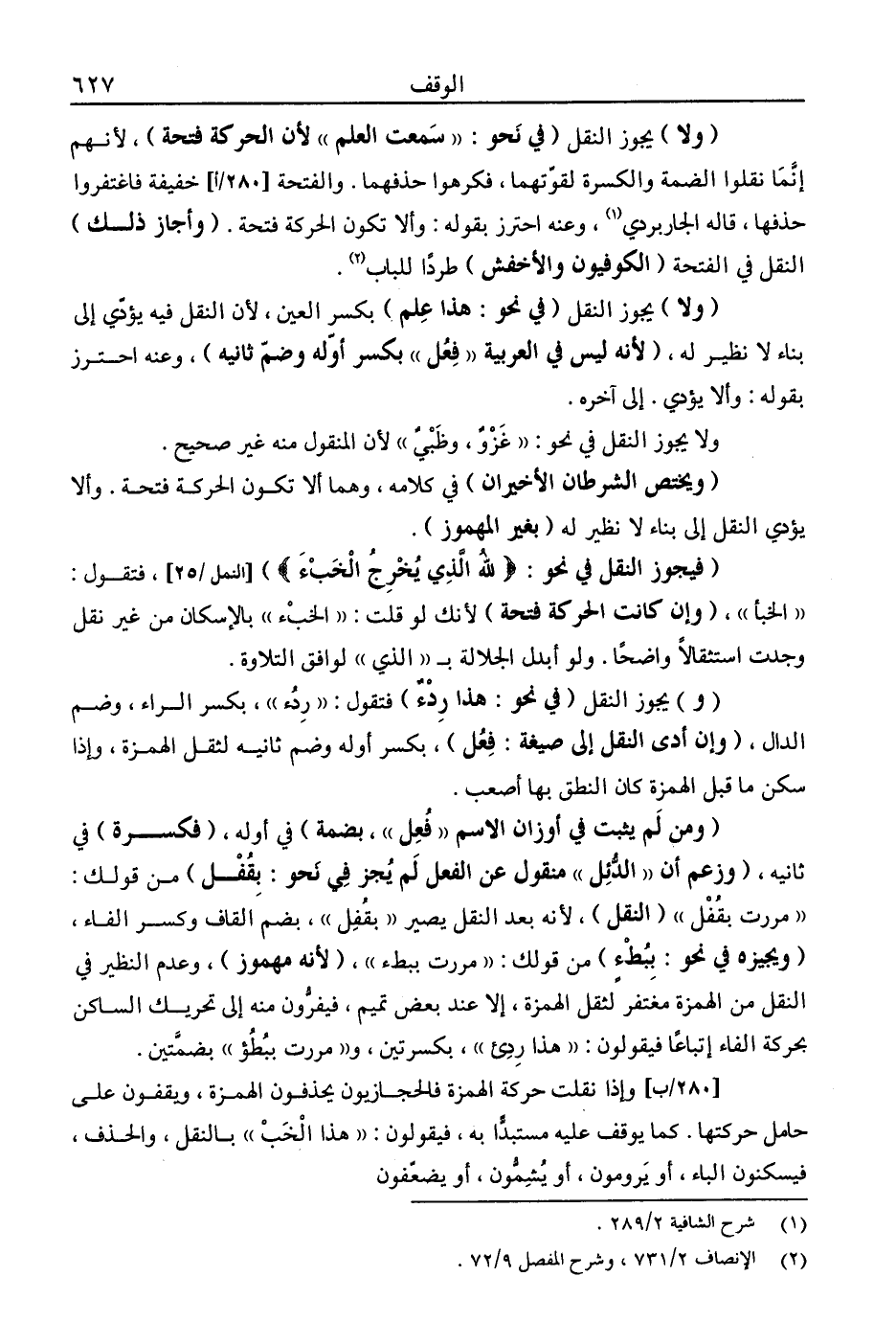 "ويختص الشرطان الأخيران" في كلامه، وهما ألا تكون الحركة فتحة. وألا يؤدي النقل إلى بناء لا نظير له "بغير المهموز".