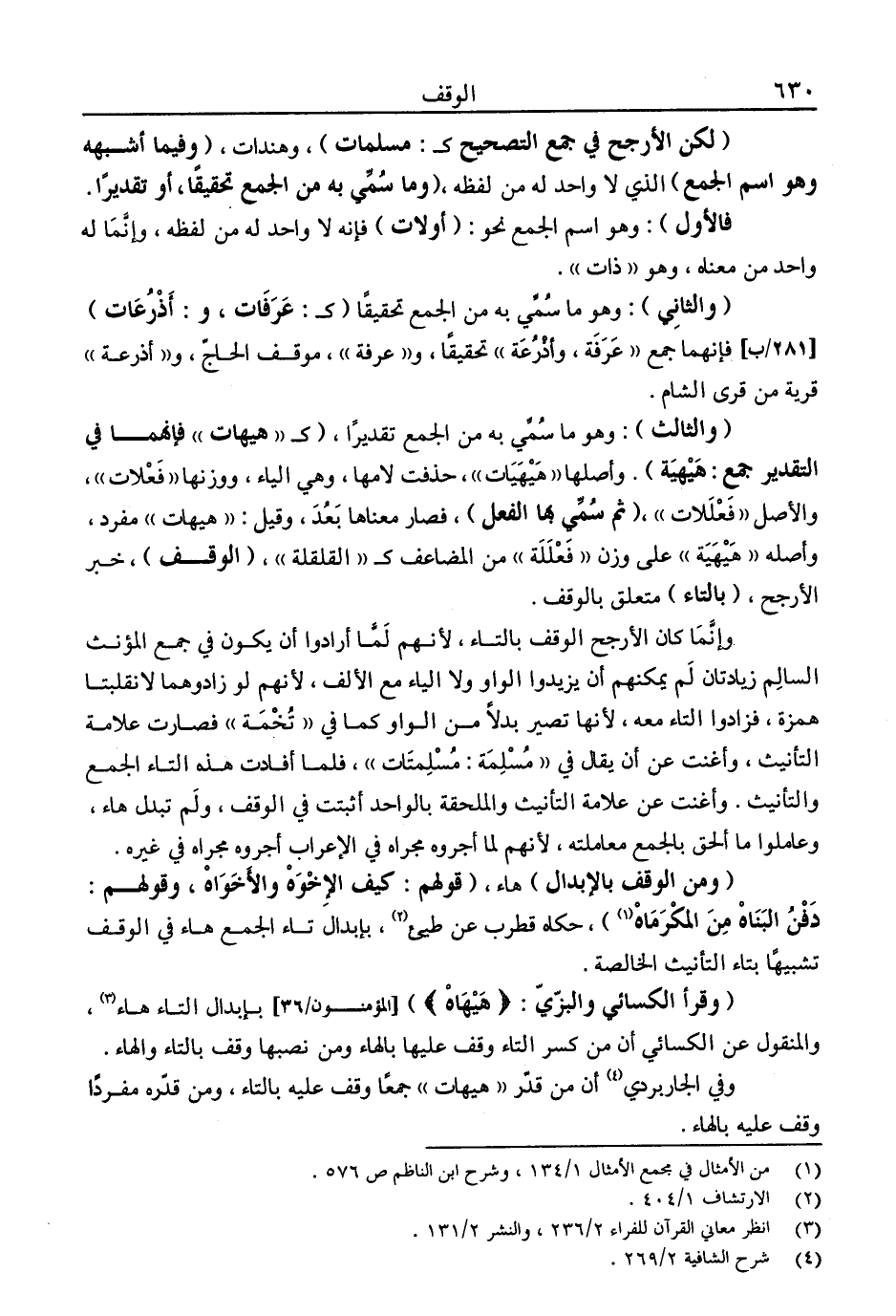 وإنما كان الأرجح الوقف بالتاء، لأنهم لما أرادوا أن يكون في جمع المؤنث السالم زيادتان لم يمكنهم أن يزيدوا الواو ولا الياء مع الألف، لأنهم لو زادوهما لانقلبتا همزة، فزادوا التاء معه، لأنها تصير بدلا من الواو كما في "تخمة" فصارت علامة التأنيث، وأغنت عن أن يقال في "مسلمة: مسلمتات"، فلما أفادت هذه التاء الجمع والتأنيث. وأغنت عن علامة التأنيث والملحقة بالواحد أثبتت في الوقف، ولم تبدل هاء، وعاملوا ما ألحق بالجمع معاملته، لأنهم لما أجروه مجراه في الإعراب أجروه مجراه في غيره.