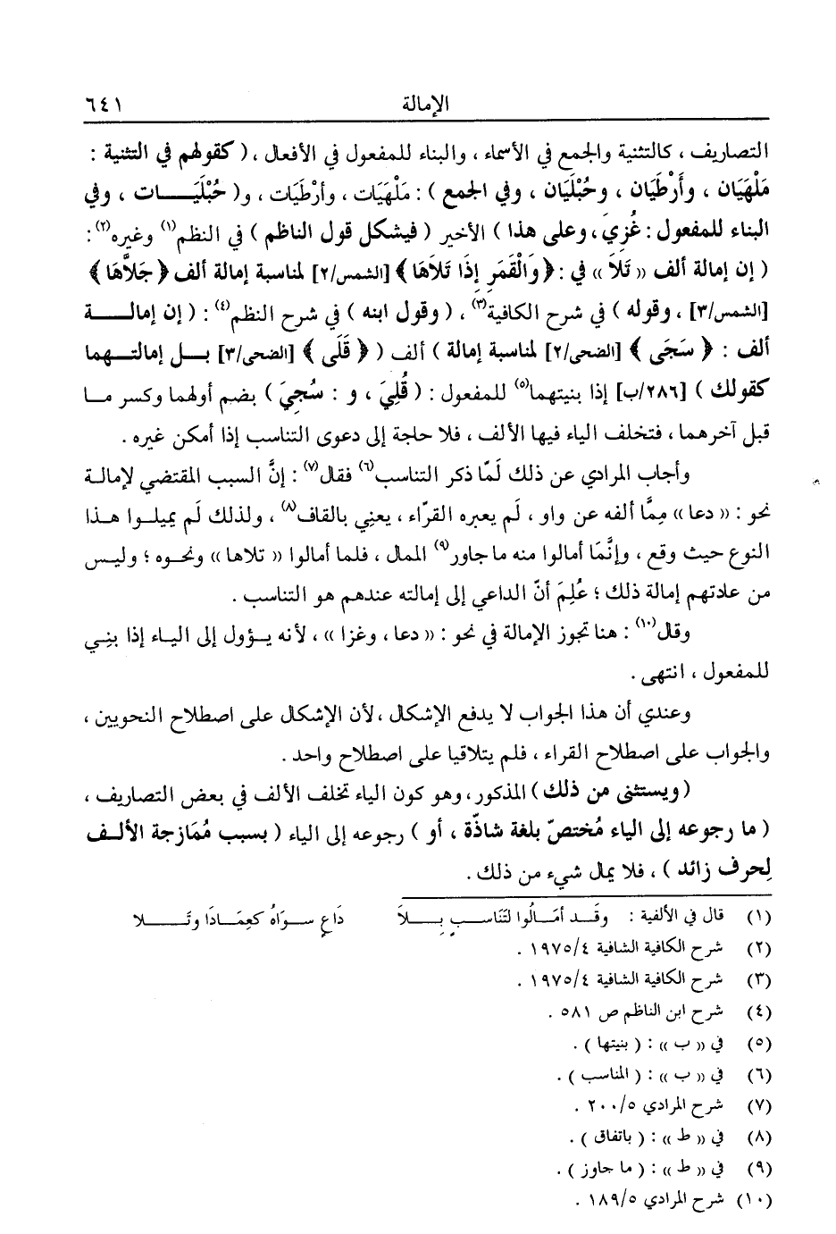 التصاريف، كالتثنية والجمع في الأسماء، والبناء للمفعول، في الأفعال، "كقولهم في التثنية: مليهان، وأرطيان، وحبليان، وفي الجمع": ملهيات، وأرطيات، و"حبليات، وفي البناء للمفعول: غزي، وعلى هذا" الأخير" "فيشكل قول الناظم" في النظم1 وغيره2: "إن إمالة ألف "تلا" في: {وَالْقَمَرِ إِذَا تَلَاهَا} [الشمس: 2] لمناسبة إمالة ألف {جَلَّاهَا} [الشمس: 3] ، وقوله" في شرح الكافية3، "وقول ابنه" في شرح النظم4: "إن إمالة ألف: {سَجَى} [الضحى: 2] لمناسبة إمالة" ألف {قَلَى} [الضحى: 3] بل إمالتهما كقولك" إذا بنيتهما5 للمفعول: "قُلِيَ، و: سُجِيَ" بضم أولهما وكسر ما قبل آخرهما، فتخلف الياء فيها الألف، فلا حاجة إلى دعوى التناسب إذا أمكن غيره.