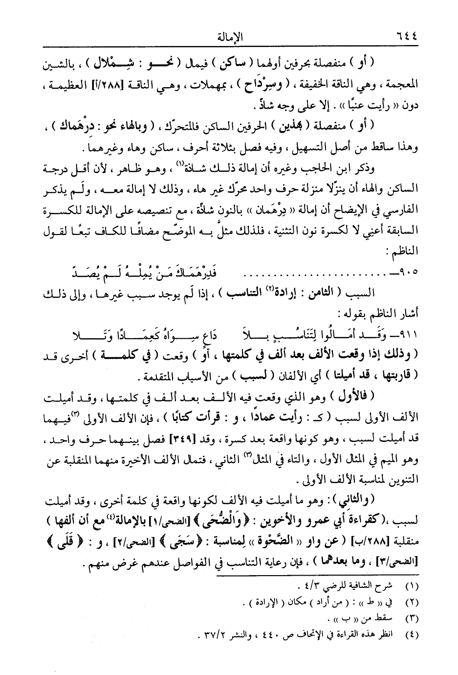 وذكر ابن الحاجب وغيره أن إمالة ذلك شاذة1، وهو ظاهر، لأن أقل درجة الساكن والهاء أن ينزلا منزلة حرف واحد محرك غير هاء، وذلك لا إمالة معه، ولم يذكر الفارسي في الإيضاح أن إمالة "درهمان" بالنون شاذة، مع تنصيصه على الإمالة للكسرة السابقة أعني لا لكسرة نون التثنية، فلذلك مثل به الموضح مضافًا للكاف تبعًا لقول الناظم: