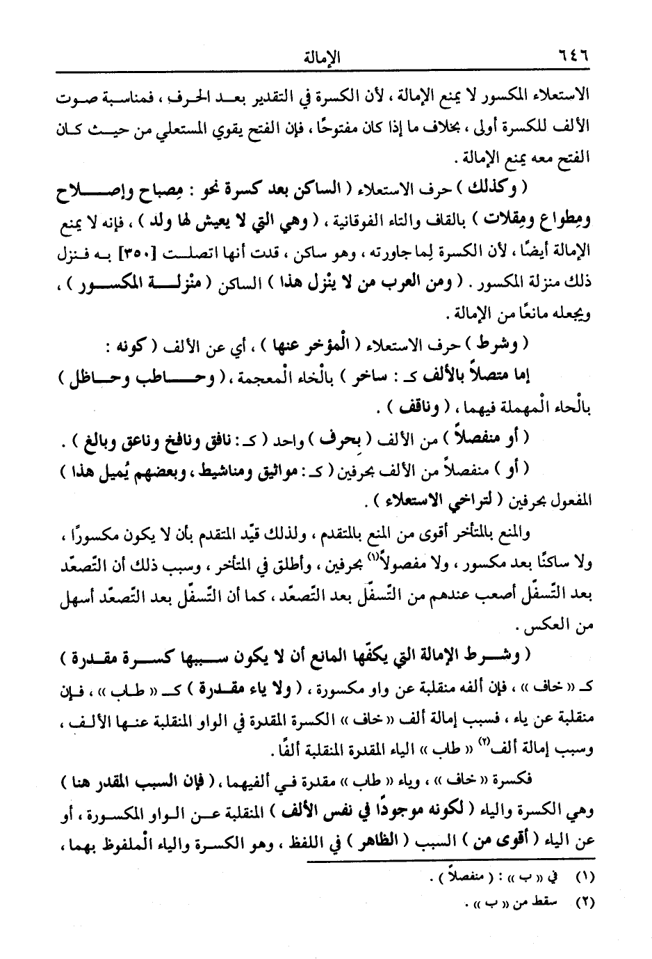 "وشرط الإمالة التي يكفها المانع أن لا يكون سببها كسرة مقدرة" كـ"خاف" فإن ألفه منقلبة عن واو مكسورة, "ولا ياء مقدرة" كـ"طاب"، فإنها منقلبة عن ياء، فسبب إمالة ألف "خاف" الكسرة المقدرة في الواو المنقلبة عنها الألف، وسبب إمالة ألف2 "طاب" الياء المقدرة المنقلبة ألفًا.