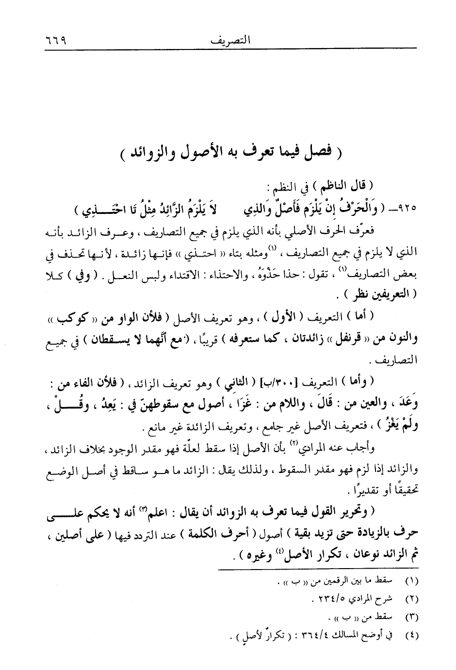 "وتحرير القول فيما تعرف به الزوائد أن يقال: اعلم3 أنه لا يحكم على حرف بالزيادة حتى تزيد بقية" أصول "أحرف الكلمة" عند التردد فيها "على أصلين، ثم الزائد نوعان، تكرار الأصل4 وغيره".