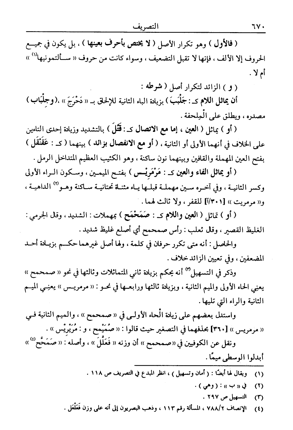 وذكر في التسهيل3 أنه يحكم بزيادة ثاني المتماثلات وثالثها في نحو "صمحمح" يعني الحاء الأولى والميم الثانية، وبزيادة ثالثها ورابعها في نحو: "مرمريس" يعني الميم الثانية والراء التي تليها.