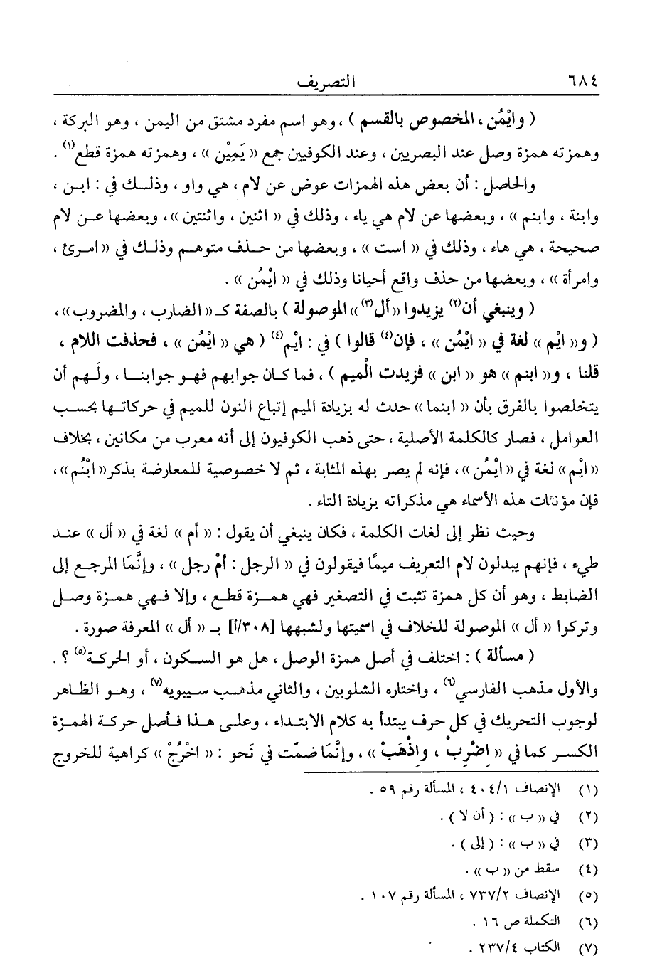 "وينبغي أن2 يزيدوا "أل"3 الموصولة" بالصفة كـ "الضارب، والمضروب"، "و"ايم" لغة في "ايمن"، فإن4 قالو" في: ايم4 "هي "ايمن"، فحذفت اللام، قلنا و"ابنم" هو "ابن" فزيدت الميم"، فما كان جوابهم فهو جوابنا، ولهم أن يتخلصوا بالفرق بأن "ابنما" حدث له بزيادة الميم إتباع النون للميم في حركاتها بحسب العوامل، فصار كالكلمة الأصلية، حتى ذهب الكوفيون إلى أنه معرب من مكانين، بخلاف "ايم" لغة في "ايمن"، فإنه لم يصر بهذه المثابة، ثم لا خصوصية للمعارضة بذكر "ابنم"، فإن مؤنثات هذه الأسماء هي مذكراته بزيادة التاء.