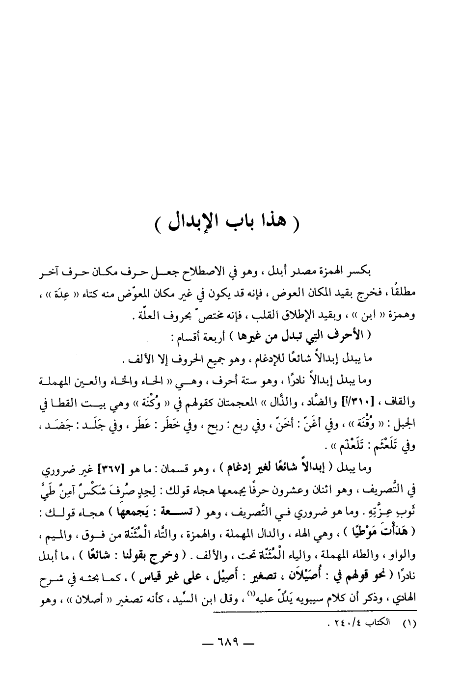 وما يبدل إبدالا نادرًا، وهو ستة أحرف، وهي "الحاء والخاء والعين المهملة والقاف، والضاد، والذال" المعجمتان كقولهم في "وكنة" وهي بيت القطا في الجبل: "وقنة"، وفي أغن: أخن، وفي ربع: ربح، وفي خطر: عطر، وفي جلد: جضد، وفي تلعثم: تلعذم".