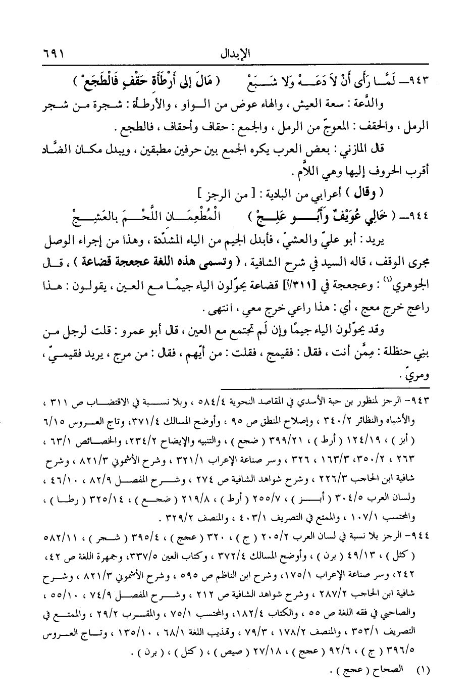 943- الرجز لمنظور بن حبة الأسدي في المقاصد النحوية 4/ 584، وبلا نسبة في الاقتضاب ص311، والأشباه والنظائر 2/ 340، وإصلاح المنطق ص95، وأوضح المسالك 4/ 371، وتاج العروس 15/ 6 "أبز"، 19/ 124 "أرط", 21/ 399 "ضجع", والتنبيه والإيضاح 2/ 234، والخصائص 1/ 63، 263، 2/ 350، 3/ 163، 326، وسر صناعة الإعراب 1/ 321، وشرح الأشموني 3/ 821، وشرح شافية ابن الحاجب 3/ 226، وشرح شواهد الشافية ص274، وشرح المفصل 9/ 82، 10/ 64، ولسان العرب 5/ 304 "أبز"، 7/ 255 "أرط"، 8/ 219، "ضجع", 14/ 325 "رطا", والمحتسب 1/ 107، والممتع في التصريف 1/ 403، والمنصف 2/ 329.