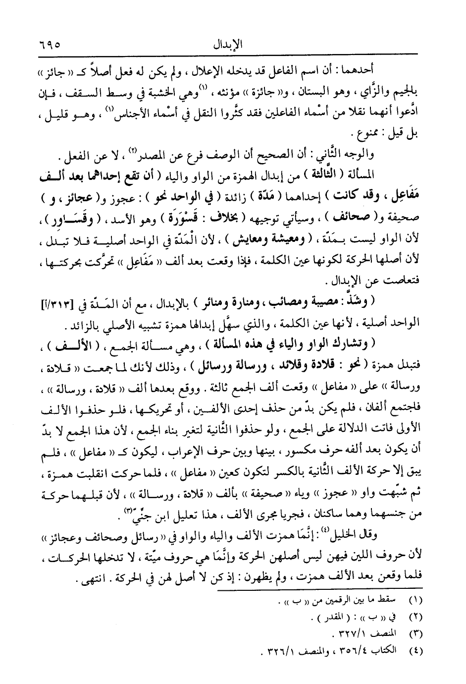 وقال الخليل4: إنما همزت الألف والياء والواو في "رسائل وصحائف وعجائز" لأن حروف اللين فيهن ليس أصلهن الحركة وإنما هي حروف ميتة، لا تدخلها الحركات فلما وقعن بعد الألف همزت، ولم يظهرن، إذ كن لا أصل لهن في الحركة، انتهى.
