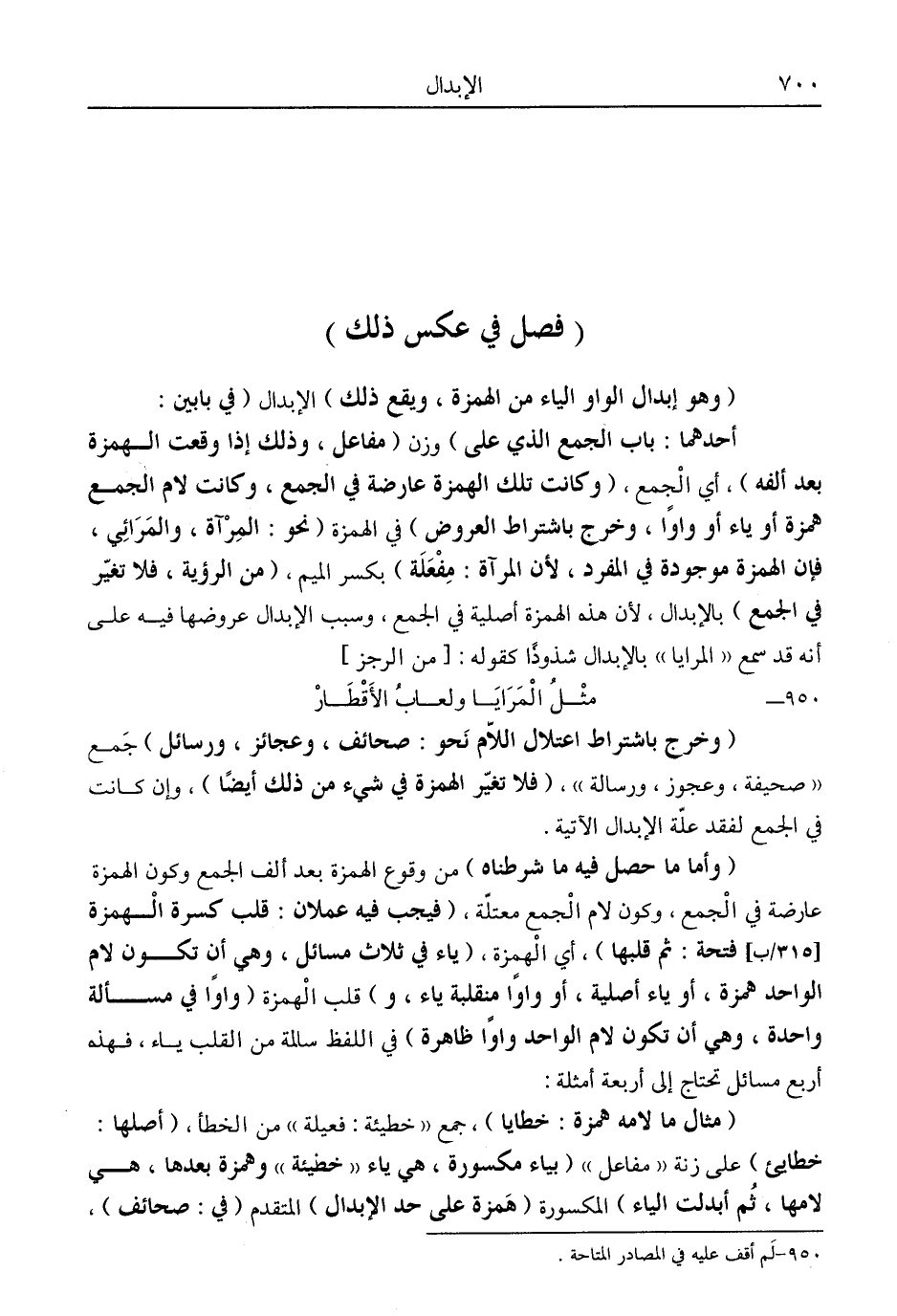 أحدهما: باب الجمع الذي على" وزن "مفاعل، وذلك إذا وقعت الهمزة بعد ألفه"، أي الجمع، "وكانت تلك الهمزة عارضة في الجمع، وكانت لام الجمع همزة أو ياء أو واوًا، وخرج باشتراط العروض" في الهمزة "نحو: المرآة، والمرائي، فإن الهمزة موجودة في المفرد، لأن المرآة: مفعلة": بكسر الميم، "من الرؤية، فلا تغير في الجمع"، بالإبدال، لأن هذه الهمزة أصلية في الجمع، وسبب الإبدال عروضها فيه على أنه قد سمع "المرايا" بإبدال شذوذًا كقوله: [من الرجز]