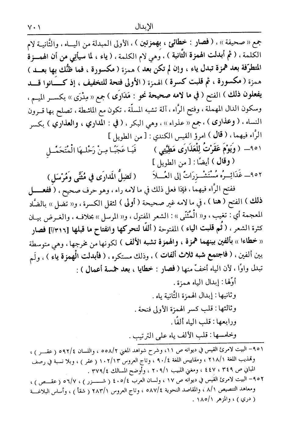 جمع "صحيفة"، "فصار: خطائئ، بهممزتين"، الأولى المبدلة من الياء، والثانية لام الكلمة، "ثم أبدلت الهمزة الثانية"، وهي لام الكلمة، "ياء، لما سيأتي من أن الهمزة المتطرفة بعد همزة تبدل ياء، وإن لم تكن بعد" همزة "مكسورة، فما ظنك بها بعد" همزة "مكسورة، ثم قلبت كسرة" الهمزة "الأولى فتحة للتخفيف، إذ كانوا قد يفعلون ذلك" الفتح "في ما لامه صحيحة نحو: مداري" جمع "مدرى" بكسر الميم، وسكون الدل المهملة، وفتح الراء، آلة تشبه المسلة، تكون مع الماشطة، تصلح بها قرون النساء، "وعذارى"، جمع "عذارء"، وهي البكر، "في: المداري، والعذاري" بكسر الراء فيهما، "قال" امرؤ القيس الكندي: [من الطويل]