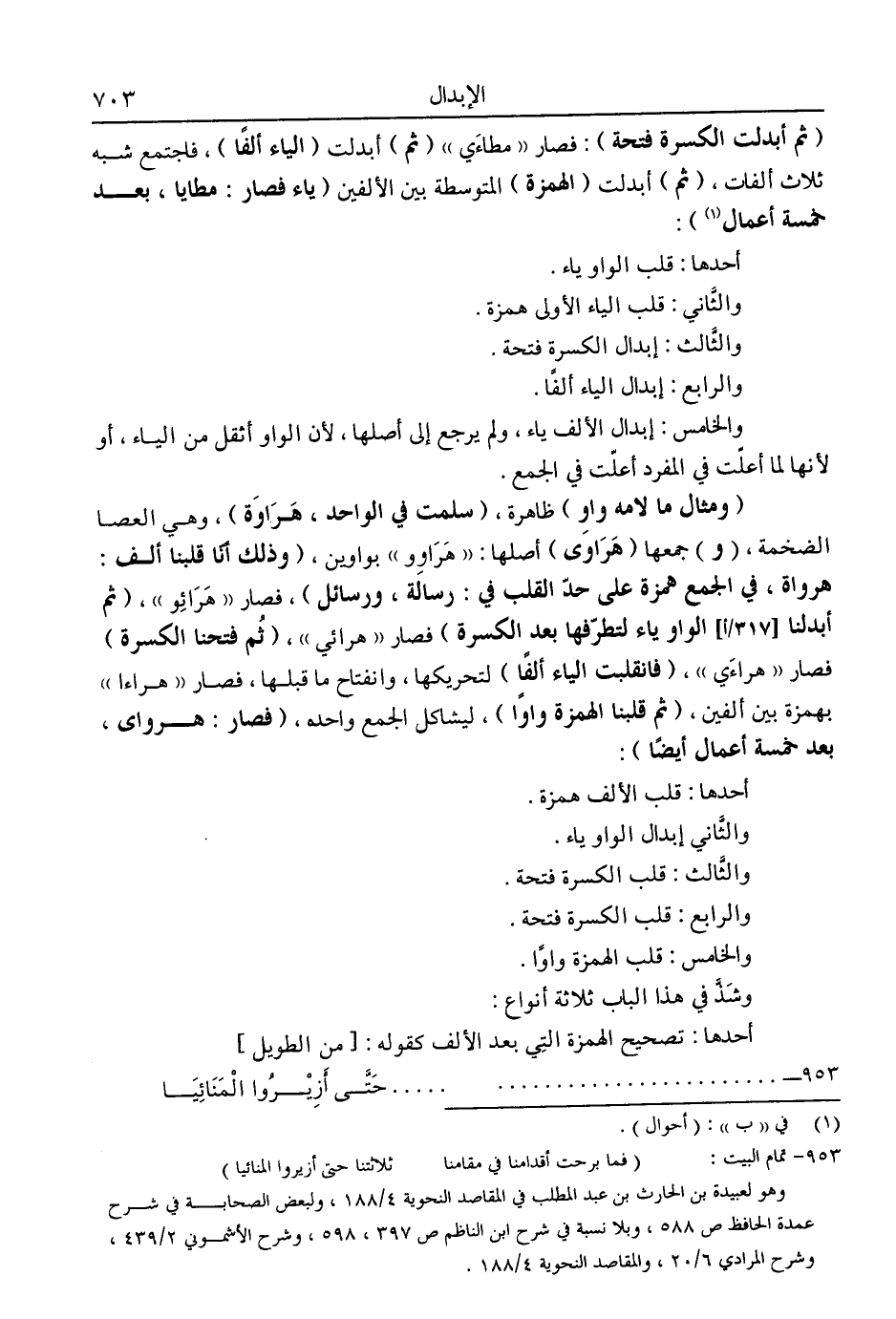 "ثم أبدلت الكسرة فتحة": فصار "مطاءي" "ثم" أبدلت "الياء ألفًا" فاجتمع شبه ثلاث ألفات، "ثم" أبدلت "الهمزة" المتوسطة بين الألفين "ياء فصار: مطايا، بعد خمسة أعمال"1.