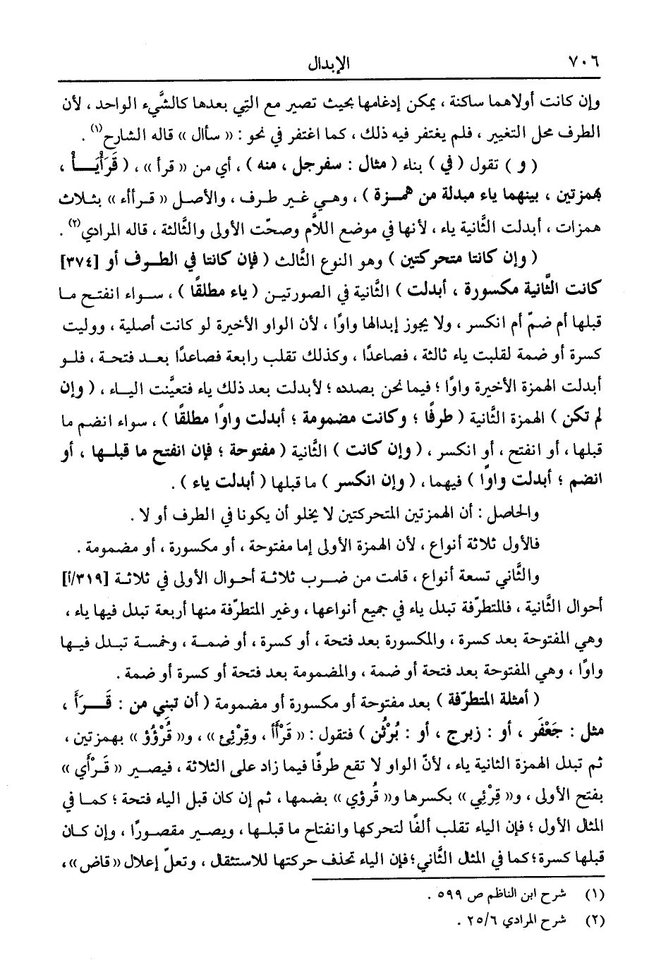 "وإن كانتا متحركتين" وهو النوع الثالث "فإن كانتا في الطرف أو كانت الثانية مكسورة، أبدلت" الثانية في الصورتين "ياء مطلقًا"، سواء انفتح ما قبلها أم ضم أم انكسر، ولا يجوز إبدالها واوا، لأن الواو الأخيرة لو كانت أصلية، ووليت كسرة أو ضمة لقلبت ياء ثالثة، فصاعدًا، وكذلك تقلب رابعة فصاعدًا بعد فتحة، فلو أبدلت الهمزة الأخيرة واوًا؛ فيما نحن بصدده؛ لأبدلت بعد ذلك ياء فتعينت الياء، "وإن لم تكن" الهمزة الثانية "طرفًا؛ وكانت مضمومة؛ أبدلت واوًا مطلقًا"، سواء انضم ما قبلها؛ أو انفتح، أو انكسر، "وإن كانت" الثانية "مفتوحة؛ فإن انفتح ما قبلها، أو انضم؛ أبدلت واوًا" فيهما، "وإن انكسر" ما قبلها "أبدلت ياء".