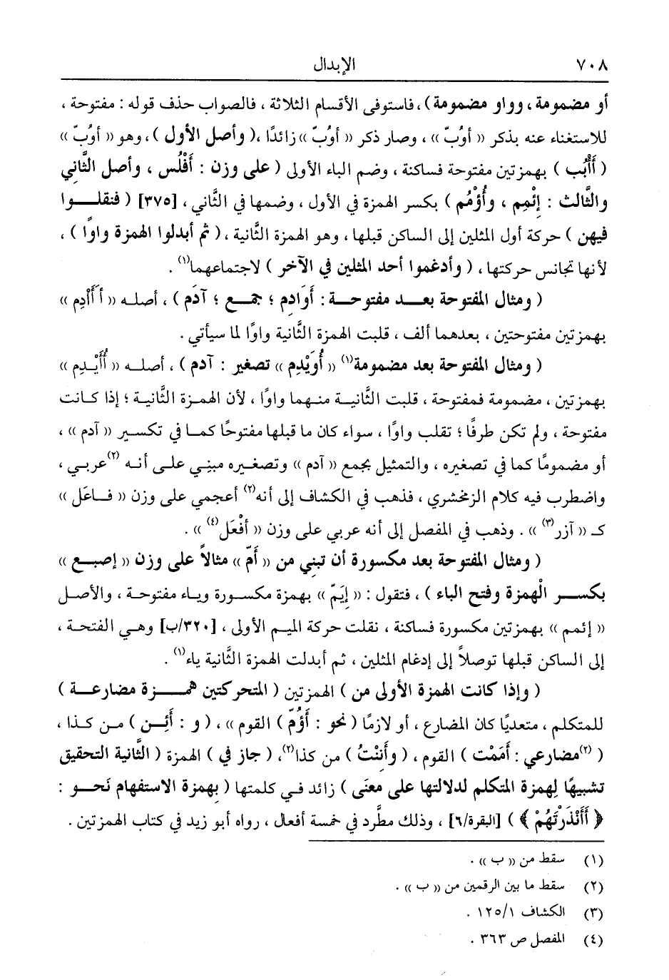 "ومثال المفتوحة بعد مضمومة1 "أويدم" تصغير: "آدم"، أصله "أأيدم بهمزتين مضمومة فمفتوحة، قلبت الثانية منهما واوا، لأن الهمزة الثانية؛ إذا كانت مفتوحة، ولم تكن طرفًا؛ تقلب واوًا، سواء كان ما قبلها مفتوحًا كما في تكسير "آدم"، أو مضمومًا كما في تصغيره، والتمثيل بجمع "آدم" وتصغيره مبني على أنه [عربي، واضطرب فيه كلام الزمخشري، فذهب في الكشاف إلى أنه] 2 أعجمي على وزن "فاعل" كـ"آزر"3. وذهب في المفصل إلى أنه عربي على وزن "أفعل"4.