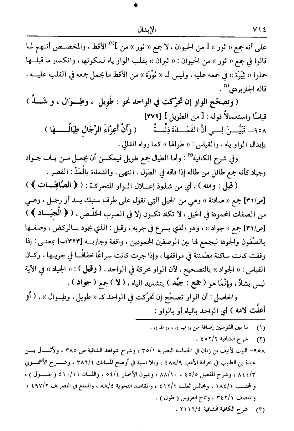 "قيل: ومنه" أي من شذوذ إعلال الواو المتحركة: " {الصَّافِنَاتُ} " [ص: 31] جمع "صافنة" وهي من الخيل التي تقوم على طرف سنبك يد أو رجل، وهي من الصفات المحمودة في الخيل، لا تكاد تكون إلا في العرب الخلص، " {الْجِيَادُ} " [ص: 31] جمع "جواد"، وهو الذي يسرع في جريه، وقيل: الذي يجوز بالركض، وصفها بالصفون والجودة ليجمع لها بين الوصفين المحمودين، واقفة وجارية بمعنى: إذا وقفت كانت ساكنة مطمئنة في مواقفها، وإذا جرت كانت سراعًا خفافًا في جريها، وكان القياس: "الجواد" بالتصحيح، لأن الواو محركة في الواحد. "وقيل": "الجياد" في الآية ليس بشاذ، وإنما هو" جمع: جيد" بتشديد الياء، "لا" جمع "جواد.