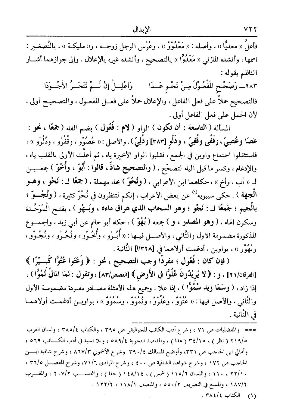"فإن كان: فعول؛ مفردًا وجب التصحيح، نحو: {وَعَتَوْا عُتُوًّا كَبِيرًا} [الفرقان: 21] ، و {لَا يُرِيدُونَ عُلُوًّا فِي الْأَرْضِ} [القصص: 83] ، وتقول: نما المال نموا"، إذا زاد، "وسما زيد سموا" إذا علا، وجميع هذه الأمثلة مصادر مفردة مضمومة الأول والثاني، والأصل فيها: "عتوو، وعلوو، ونموو، وسموو"، بواوين أدغمت أولاهما في الثانية.