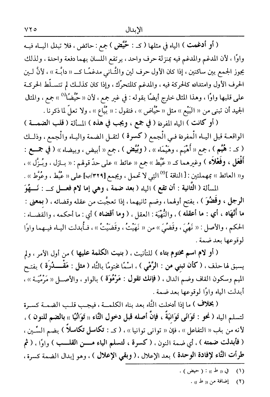 "أو كانت" الياء المفردة "في جمع، ويجب في هذه" المسألة "قلب الضمة" الواقعة قبل الياء المفردة في الجمع "كسرة" لثقل الضمة والياء والجمع، وذلك "كـ: هيم" جمع "أهيم، وهيماء"، "وبيض"، جمع "أبيض، وبيضاء" "في جمع أفعل، وفعلاء" وغيرهما كـ"عيط" جمع "عائط" على حد قولهم: "بازل، وبزل"، و"العائط" بمهملتين: [الناقة] 2 التي لا تحمل، ويجمع على "عيط، وعوط".