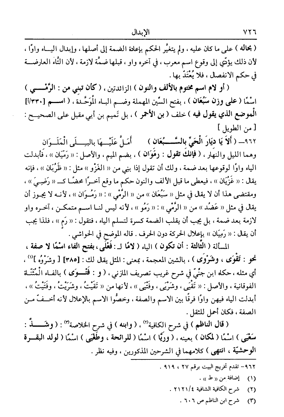 وهما الليل والنهار. "فإنك تقول: رموان"، بضم الميم، والأصل: "رميان" فأبدلت الياء، واوًا لوقوعها بعد ضمة، ولك أن تقول إذا بني من "الغزو" مثل: "ظربان"، فإنه يقال: "غزيان"، فيعطى ما قبل الألف والنون حكم ما وقع آخرًا محضًا كـ"رضي"، ومقتضى هذا أن لا يقال في مثل "سبعان" من "الرمي": "رموان"، لأنه لا يجوز أن يقال في مثل "عضد" من "الرمي": "رمو" لأنه ليس لنا اسم متمكن، آخره واوًا لازمة بعد ضمة، بل يجب أن يقلب الضمة كسرة لتسلم الياء فتقول: "رم" فلذا يجب أن يقال: "رميان" بإعلال الحركة دون الحرف. قاله الموضح في الحواشي.