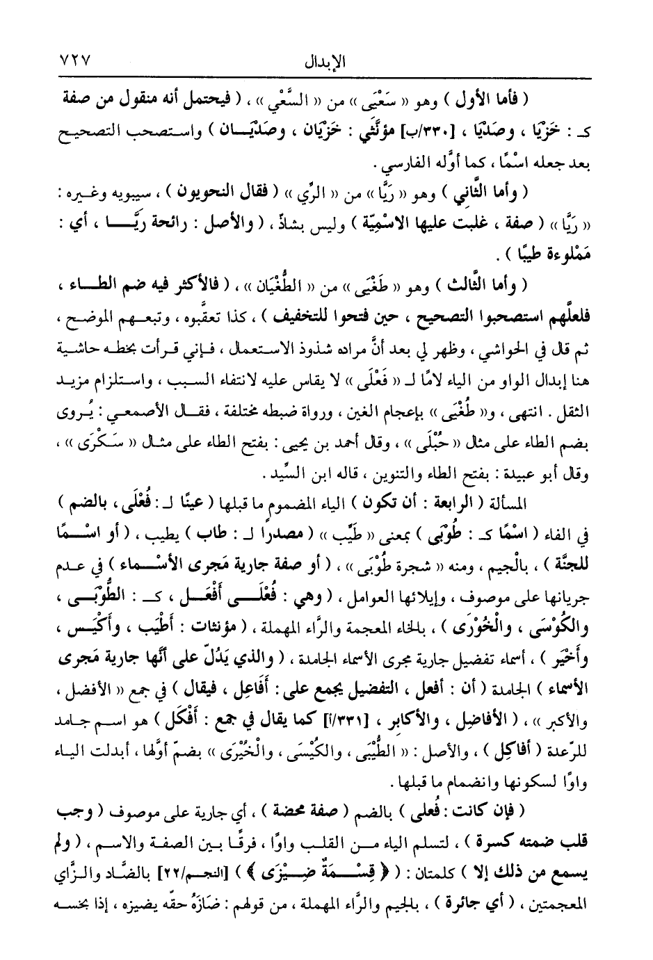 المسألة: "الرابعة: أن تكون" الياء المضموم ما قبلها "عينًا لـ: فعلى، بالضم" في الفاء "اسمًا كـ: طوبى" بمعنى "طيب" "مصدرًا لـ: طاب" يطيب، "أو اسمًا للجنة". بالجيم، ومنه "شجرة طوبى"، "أو صفة جارية مجرى الأسماء" في عدم جريانها على موصوف، وإيلائها العوامل، "وهي: فعلى أفعل، كـ: الطوبى، والكوسى، والخورى"، بالخاء المعجمة والراء المهملة، "مؤنثات: أطيب، وأكيس، وأخير"، أسماء تفضيل جارية مجرى الأسماء الجامدة. "والذي يدل على أنها جارية مجرى الأسماء" الجامدة "أن: أفعل، التفضيل يجمع على: أفاعل، فيقال" في جمع "الأفضل، والأكبر"، "الأفاضل، والأكابر كما يقال في جمع: أفكل" هو اسم جامد للرعدة "أفاكل"، والأصل: "الطيبى، والكيسى، والخيرى" بضم أولها، أبدلت الياء واوًا لسكونها وانضمام ما قبلها.