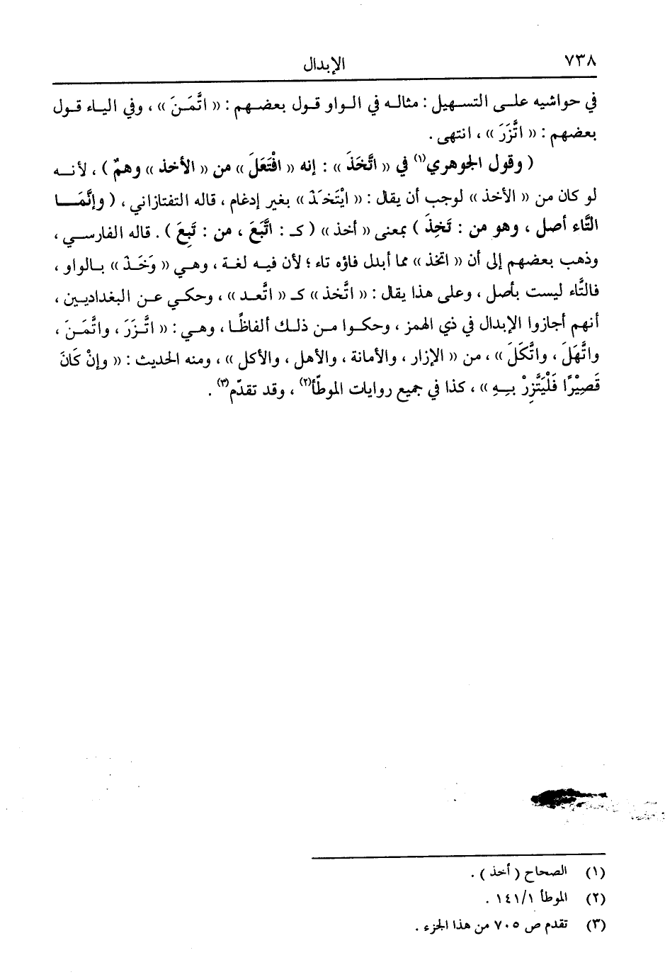 "وقول الجوهري1 في "اتخذ": إنه "افتعل" من "الأخذ" وهم"، لأنه لو كان من "الأخذ" لوجب أن يقال: "ايتخذ" بغير إدغام، قاله التفتازاني، "وإنما التاء أصل، وهو من: تخذ" بمعنى "أخذ" "كـ: اتبع، من: تبع". قاله الفارسي، وذهب بعضهم إلى أن "اتخذ" مما أبدل فاؤه تاء؛ لأن فيه لغة، وهي "وخذ" بالواو، فالتاء ليست بأصل، وعلى هذا يقال: "اتخذ" كـ"اتعد"، وحكي عن البغداديين، أنهم أجازوا الإبدال في ذي الهمز، وحكوا من ذلك ألفاظا، وهي: "اتزر، واتمن، واتهل، واتكل"، من "الإزار، والأمانة، والأهل، والأكل"، ومنه الحديث: "وإن كان قصيرًا فليتزر به"، كذا في جميع روايات الموطأ2، وقد تقدم3.