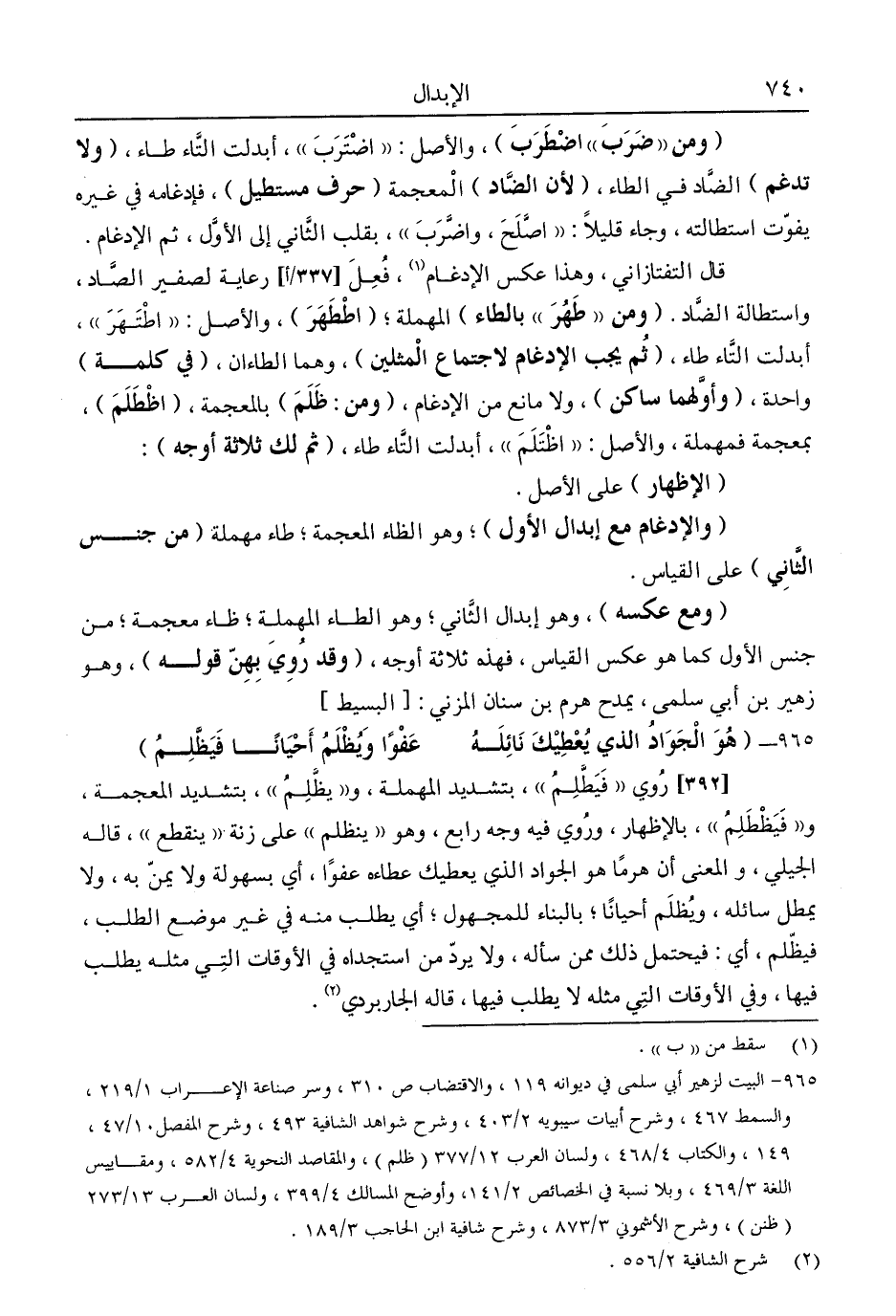 "ومع عكسه"، وهو إبدال الثاني؛ وهو الطاء المهملة؛ ظاء معجمة؛ من جنس الأول كما هو عكس القياس، فهذه ثلاثة أوجه. "وقد روي بهن قوله"، وهو زهير بن أبي سلمى، يمدح هرم بن سنان المزني: [من البسيط]