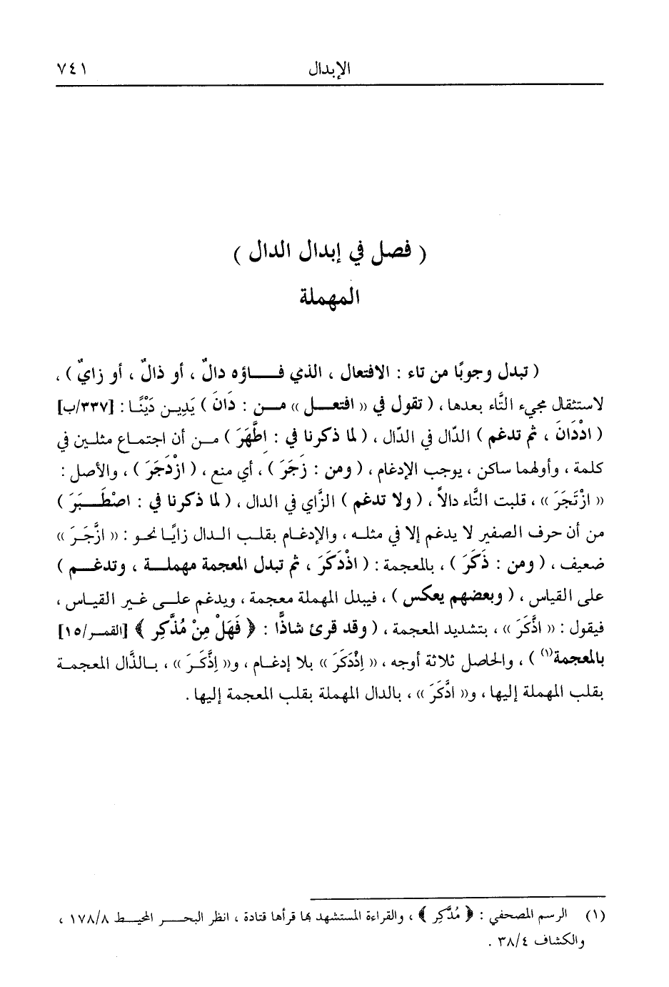 "تبدل وجوبًا من تاء: الافتعال، الذي فاؤه دال، أو ذال، أو زاي" لاستثقال مجيء التاء بعدها، "تقول في "افتعل" من: دان" يدين دينا: "اددان، ثم تدغم" الدال في الدال، "لما ذكرنا في: اطهر" من أن اجتماع مثلين في كلمة، وأولهما ساكن، يوجب الإدغام، "ومن: زجر"، أي منع، "ازدجر"، والأصل: "ازتجر"، قلبت التاء دالا، "ولا تدغم" الزاي في الدال، "لما ذكرنا في: اصطبر" من أن حرف الصفير لا يدغم إلا في مثله، والإدغام بقلب الدال زايًا نحو: "ازجر" ضعيف، "ومن: ذكر"، بالمعجمة: "اذدكر، ثم تبدل المعجمة مهملة، وتدغم" على القياس. "وبعضهم يعكس"، فيبدل المهملة معجمة، ويدغم على غير القياس، فيقول: "اذكر"، بتشديد المعجمة. "وقد قرئ شاذا: "فهل من مذَّكر" [القمر: 15] بالمعجمة1" والحاصل ثلاثة أوجه: "اذدكر" بلا إدغام، و"اذكر" بالذال المعجمة بقلب المهملة إليها. و"ادكر"، بالدال المهملة بقلب المعجمة إليها.
