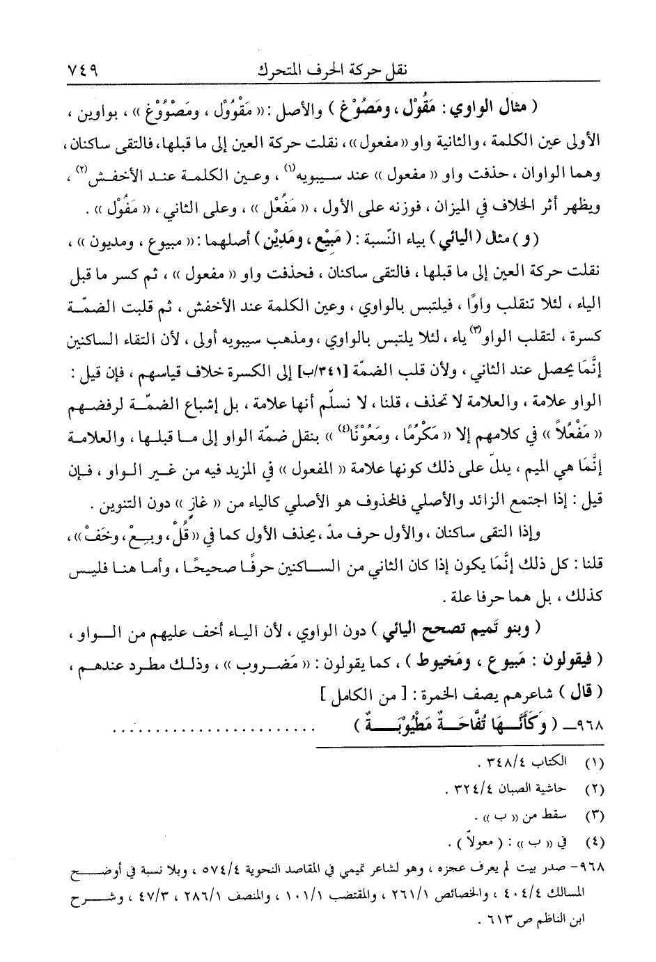 "وبنو تميم تصحح اليائي" دون الواوي، لأن الياء أخف عليهم من الواو، "فيقولون: مبيوع، ومخيوط"، كما يقولون: "مضروب" وذلك مطرد عندهم، "قال" شاعرهم يصف الخمرة: [من الكامل]