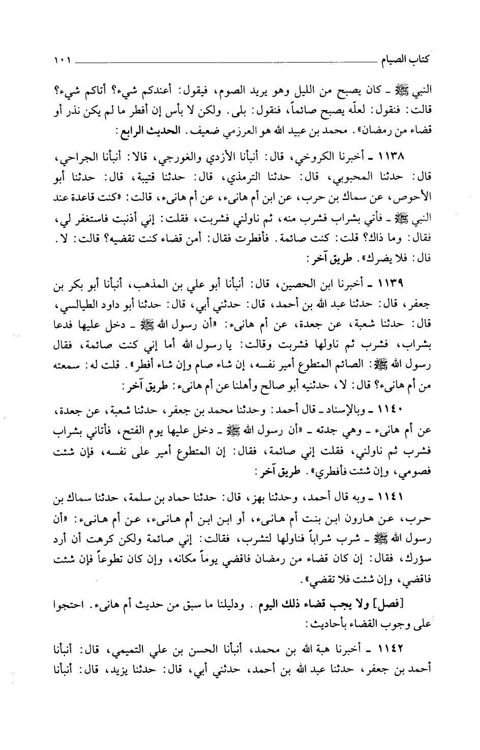 1139 - أَخْبَرَنَا ابْنُ الْحُصَيْنِ قَالَ أَنْبَأَنَا أَبُو عَلِيِّ بْنِ الْمُذْهِبِ أَنْبَأَنَا أَبُو بَكْرِ بْنُ جَعْفَرٍ قَالَ حَدَّثَنَا عَبْدُ اللَّهِ بْنُ أَحْمَدَ قَالَ حَدَّثَنِي أَبِي قَالَ حَدَّثَنَا أَبُو دَاوُدَ الطَّيَالِسِيِّ قَالَ حَدَّثَنَا شُعْبَةُ عَنْ جَعْدَةَ عَن أم هانىء أَنّ رَسُولَ اللَّهِ صَلَّى اللَّهُ عَلَيْهِ وَسَلَّمَ دَخَلَ عَلَيْهَا فَدَعَا بِشَرَابٍ فَشَرِبَ ثُمَّ نَاوَلَهَا فَشَرِبَتْ وَقَالَتْ يَا رَسُولَ اللَّهِ أَمَا إِنِّي كُنْتُ صَائِمَةً فَقَالَ رَسُولُ اللَّهِ صَلَّى اللَّهُ عَلَيْهِ وَسَلَّمَ الصَّائِمُ الْمُتَطَوِّعُ أَمِيرُ نَفْسِهِ إِنْ شَاءَ صَامَ وإِن شَاءَ أَفْطَرَ قُلْتُ لَهُ سَمِعْتَهُ من أم هانىء قَالَ لَا حَدَّثَنِيهِ أَبُو صَالِحٍ وأهلنا عَن أم هانىء طَرِيقٌ آخَرُ