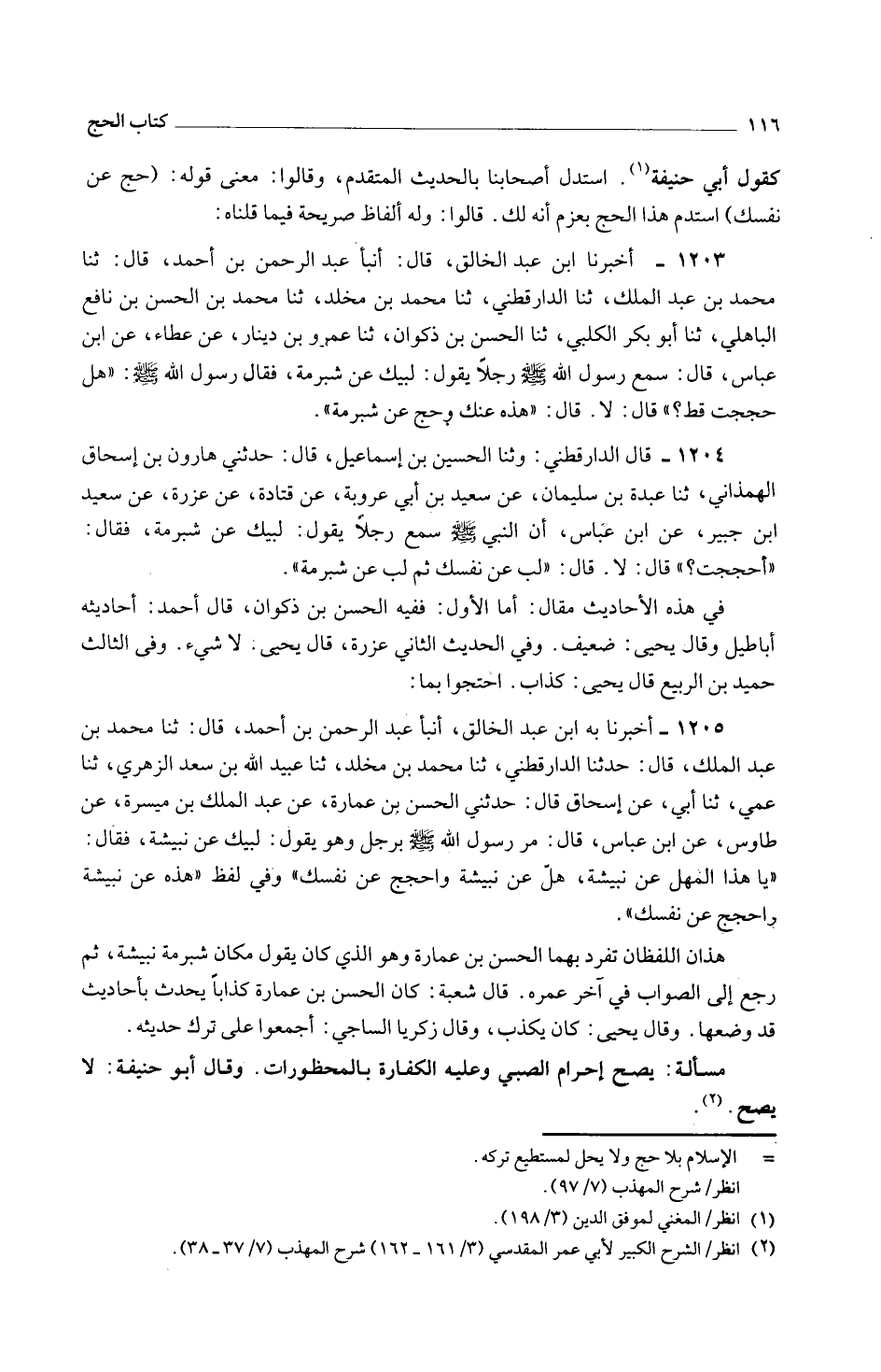 1204 - قَالَ الدَّارَقُطْنِيّ وثنا الْحُسَيْنُ بْنُ إِسْمَاعِيلَ قَالَ حَدَّثَنِي هَارُون بن إِسْحَاق الهمذاني ثَنَا عَبْدَةُ بْنُ سُلَيْمَانَ عَنْ سَعِيدِ بْنِ أَبِي عَرُوبَةَ عَنْ قَتَادَةَ عَن عزْرَة عَن سعيد ابْن جُبَيْرٍ عَنِ ابْنِ عَبَّاسٍ أَنّ النَّبِيَّ صَلَّى اللَّهُ عَلَيْهِ وَسَلَّمَ سَمِعَ رَجُلًا يَقوُلُ لَبَّيْكَ عَنْ شُبْرُمَةَ فَقَالَ أَحَجَجْتَ قَالَ لَا قَالَ لَبِّ عَنْ نَفْسِكَ ثُمَّ لَبِّ عَنْ شُبْرُمَةَ