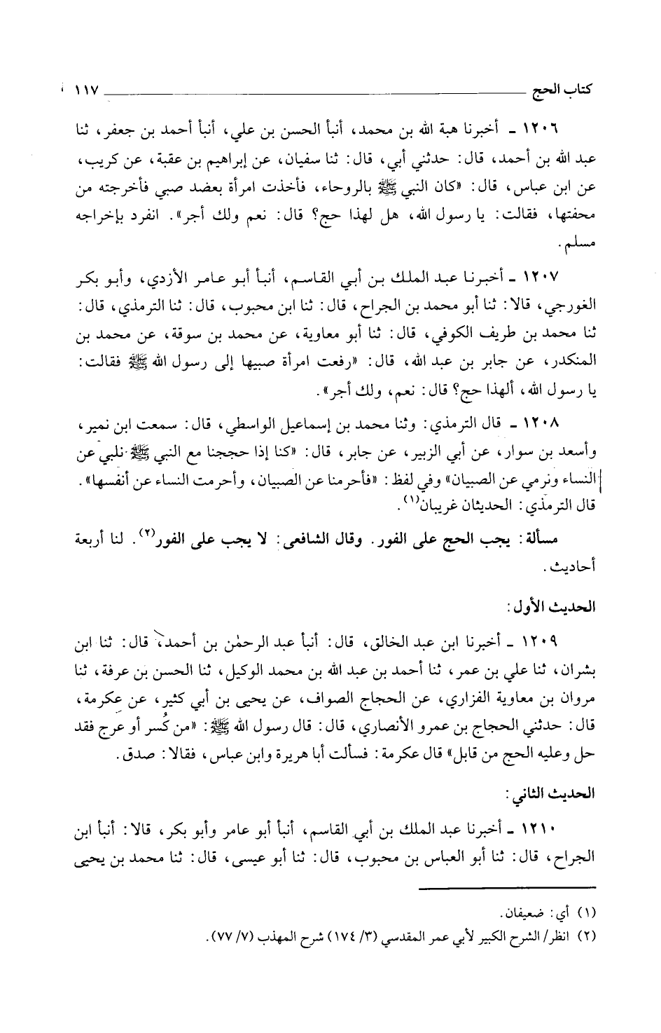 1206 - أَخْبَرَنَا هِبَةُ اللَّهِ بْنُ مُحَمَّدٍ أَنْبَأَ الْحَسَنُ بْنُ عَلِيٍّ أَنْبَأَ أَحْمد بن جَعْفَر ثَنَا عَبْدُ اللَّهِ بْنُ أَحْمَدَ قَالَ حَدثنِي أبي قَالَ ثَنَا سُفْيَانُ عَنْ إِبْرَاهِيمَ بْنِ عُقْبَةَ عَنْ كُرَيْبٍ عَنِ ابْنِ عَبَّاسٍ قَالَ كَانَ النَّبِيُّ صَلَّى اللَّهُ عَلَيْهِ وَسَلَّمَ بِالرَّوْحَاءِ فَأَخَذَتِ امْرَأَةٌ بِعَضُدِ صَبِيٍّ فَأَخْرَجَتْهُ مِنْ مَحَفَّتِهَا فَقَالَتْ يَا رَسُولَ اللَّهِ هَلْ لِهَذَا حَجٌّ قَالَ نَعَمْ وَلَكِ أَجْرٌ انْفَرَدَ بِإِخْرَاجِهِ مُسْلِمٌ