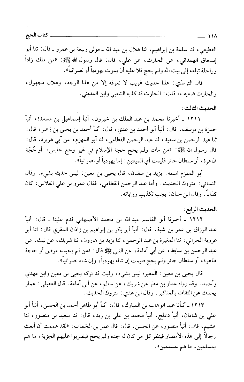 1211 - أَخْبَرَنَا مُحَمَّدُ بْنُ عَبْدِ الْمَلِكِ بْنِ خيرون أنبأ إِسْمَاعِيل بن مسْعدَة أنبأ حَمْزَة بن يُوسُف قَالَ أنبأ أَبُو أَحْمَدَ بْنُ عَدِيٍّ قَالَ أنبأ أَحْمَدُ بْنُ يَحْيَى بْنِ زُهَيْرٍ قَالَ ثَنَا عبد الرَّحْمَن بن سعيد ثَنَا عبد الرَّحْمَن الْقطَامِي ثَنَا أَبُو الْمُهْزِمِ عَنْ أَبِي هُرَيْرَةَ قَالَ قَالَ رَسُولُ اللَّهِ صَلَّى اللَّهُ عَلَيْهِ وَسَلَّمَ مَنْ مَاتَ وَلم يحجّ حجَّة الْإِسْلَام فِي غَيْرِ وَجَعٍ حَابِسٍ أَوْ حُجَّةٍ ظَاهِرَةٍ أَوْ سُلْطَانٍ جَائِرٍ فَلْيَمُتْ أَيُّ الْمَيْتَتَيْنِ إِمَّا يَهُودِيًّا أَوْ نَصْرَانِيًّا
