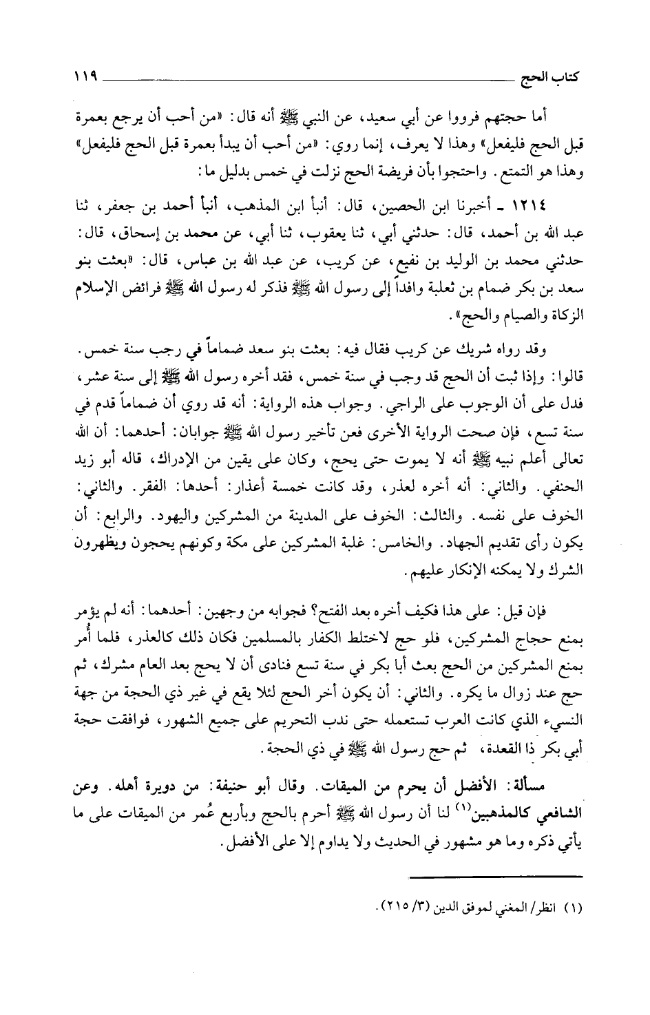 وَقَدْ رَوَاهُ شَرِيكٌ عَنْ كُرَيْبٍ فَقَالَ فِيهِ بَعَثَتْ بَنُو سعد ضَمَّامًا فِي رَجَبٍ سَنَةَ خَمْسٍ قَالُوا وَإِذا ثَبُتَ أَنَّ الْحَجَّ قَدْ وَجَبَ فِي سَنَةِ خَمْسٍ فَقَدْ أَخَّرَهُ رَسُولُ اللَّهِ صَلَّى اللَّهُ عَلَيْهِ وَسَلَّمَ إِلَى سَنَةِ عَشْرٍ فَدَلَّ على أَن الْوُجُوب على الراجي وَجَوَابُ هَذِهِ الرِّوَايَةِ أَنَّهُ قَدْ رَوَى أَنَّ ضَمَّامًا قَدِمَ فِي سَنَةِ تِسْعٍ فَإِنْ صَحَّتِ الرِّوَايَةُ الْأُخْرَى فَعَن تَأْخِيرِ رَسُولِ اللَّهِ صَلَّى اللَّهُ عَلَيْهِ وَسَلَّمَ جَوَابَانِ أَحَدُهُمَا أَنَّ الله تَعَالَى أعلم نَبِيِّهِ صَلَّى اللَّهُ عَلَيْهِ وَسَلَّمَ أَنَّهُ لَا يَمُوتُ حَتَّى يَحُجَّ وَكَانَ على يَقِين من الْإِدْرَاك قَالَهُ أَبُو زَيْدٍ الْحَنَفِيُّ وَالثَّانِي أَنَّهُ أَخَّرَهُ لِعُذْرٍ وَقَدْ كَانَتْ خَمْسَة أعذار أَحدهَا الْفقر وَالثَّانِي الْخَوْفُ عَلَى نَفْسِهِ وَالثَّالِثُ الْخَوْفُ عَلَى الْمَدِينَةِ مِنَ الْمُشْرِكِينَ وَالْيَهُودِ وَالرَّابِعُ أَنْ يَكُونَ رَأَى تَقْدِيمَ الْجِهَادِ وَالْخَامِسُ غَلَبَةُ الْمُشْرِكِينَ عَلَى مَكَّة وكونهم يحجون ويظهرون الشِّرْكَ وَلَا يُمْكِنُهُ الْإِنْكَارَ عَلَيْهِمْ