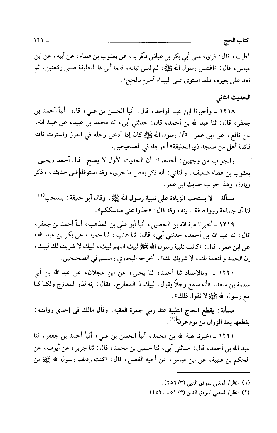 1219 - أَخْبَرَنَا هِبَةُ اللَّهِ بْنُ الْحُصَيْنِ أَنْبَأَ أَبُو عَلِيِّ بْنُ الْمُذْهِبُ أَنْبَأَ أَحْمَدُ بْنُ جَعْفَرٍ قَالَ ثَنَا عَبْدُ اللَّهِ بْنُ أَحْمَدَ حَدَّثَنِي أبي قَالَ ثَنَا هشيم ثَنَا حُمَيْدٌ عَنْ بَكْرِ بْنِ عَبْدِ اللَّهِ عَنِ ابْنِ عُمَرَ قَالَ كَانَتْ تَلْبِيَةُ رَسُولِ اللَّهِ صَلَّى اللَّهُ عَلَيْهِ وَسَلَّمَ لَبَّيْكَ اللَّهُمَّ لَبَّيْكَ لَبَّيْكَ لَا شَرِيكَ لَكَ لَبَّيْكَ إِنَّ الْحَمْدَ وَالنِّعْمَةَ لَكَ لَا شَرِيكَ لَكَ أَخْرَجَهُ الْبُخَارِيُّ وَمُسلم فِي الصَّحِيحَيْنِ