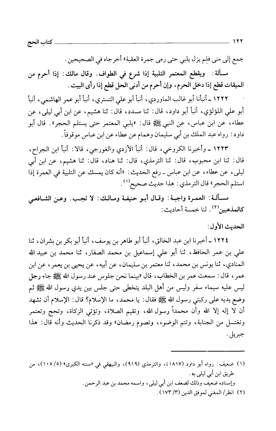 1222 - أَنْبَأَنَا أَبُو غَالِبٍ الْمَاوَرْدِيُّ أَنْبَأَ أَبُو عَلِيٍّ التُّسْتَرِيُّ أَنْبَأَ أَبُو عُمَرَ الْهَاشِمِيُّ أَنْبَأَ أَبُو عَلِيٍّ اللؤْلُؤِي أنبأ أَبُو دَاوُد قَالَ ثَنَا مُسَدّد قَالَ ثَنَا هُشَيْمٌ عَنِ ابْن أَبِي لَيْلَى عَنْ عَطَاءٍ عَنِ ابْنِ عَبَّاسٍ عَنِ النَّبِيِّ صَلَّى اللَّهُ عَلَيْهِ وَسَلَّمَ قَالَ يُلَبِّي الْمُعْتَمِرُ حَتَّى يَسْتَلِمَ الْحَجَرَ قَالَ أَبُو دَاوُدَ رَوَاهُ عَبْدُ الْمَلِكِ بْنُ أَبِي سُلَيْمَانَ وَهَمَّامٌ عَنْ عَطَاءٍ عَنِ ابْن عَبَّاس مَوْقُوفا