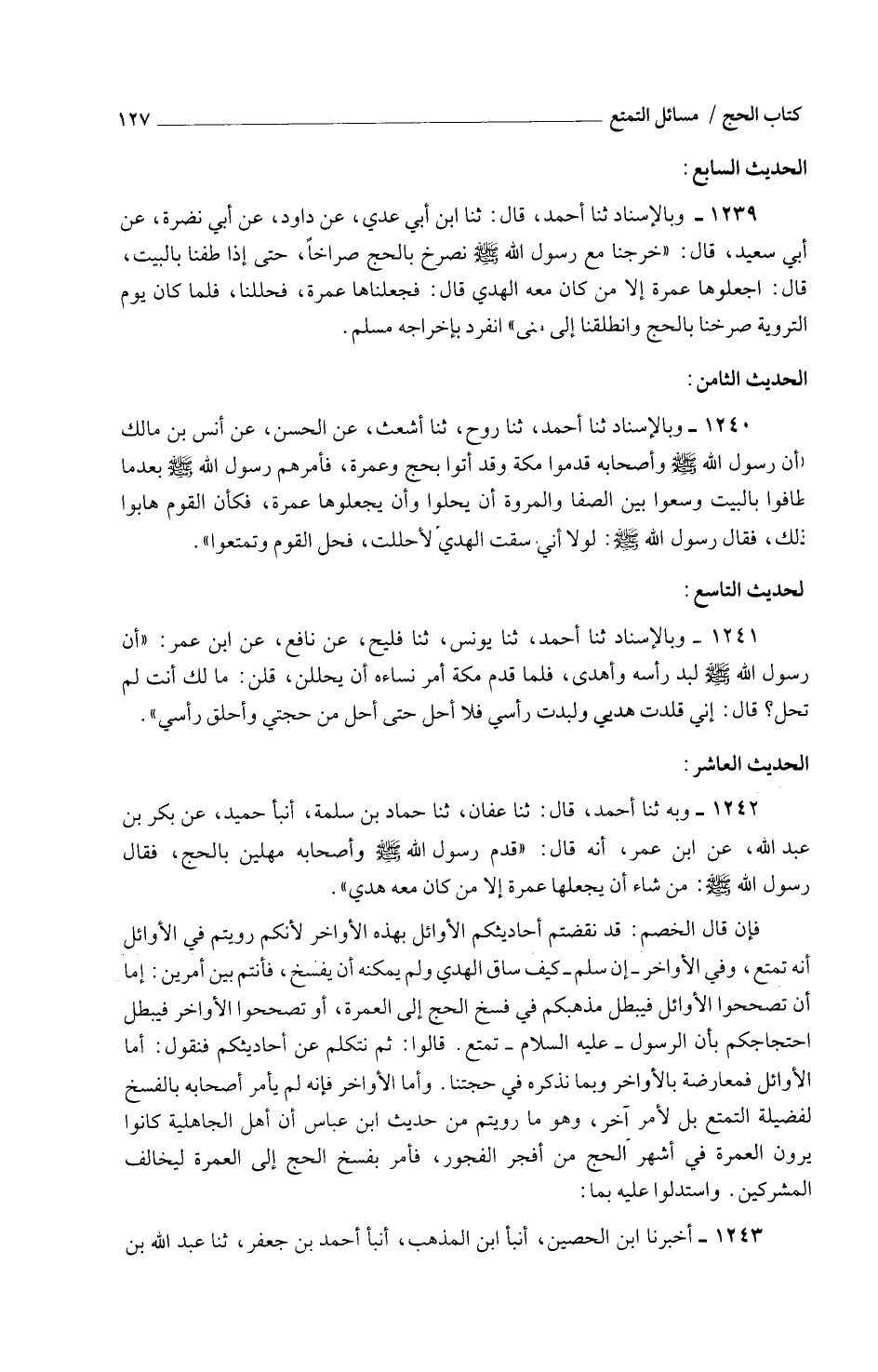 1240 - وَبِالْإِسْنَادِ ثَنَا أَحْمد ثَنَا روح ثَنَا أَشْعَثُ عَنِ الْحَسَنِ عَنْ أَنَسِ بْنِ مَالِكٍ أَنّ رَسُولَ اللَّهِ صَلَّى اللَّهُ عَلَيْهِ وَسَلَّمَ وَأَصْحَابِهِ قَدِمُوا مَكَّةَ وَقَدْ أَتُوا بِحَجٍّ وَعُمْرَةٍ فَأَمَرَهُمْ رَسُولُ اللَّهِ صَلَّى اللَّهُ عَلَيْهِ وَسَلَّمَ بَعْدَمَا طَافُوا بِالْبَيْتِ وَسَعَوا بَيْنَ الصَّفَا وَالْمَرْوَةِ أَنْ يِحِلُّوا وَأَنْ يَجْعَلُوهَا عُمْرَةً فَكَأَنَّ الْقَوْمَ هَابُوا ذَلِكَ فَقَالَ رَسُولُ اللَّهِ صَلَّى اللَّهُ عَلَيْهِ وَسَلَّمَ لَوْلَا إِنِّي سُقْتُ الْهَدْيَ لَأَحْلَلْتُ فَحَلَّ الْقَوْمُ وَتَمَتَّعُوا