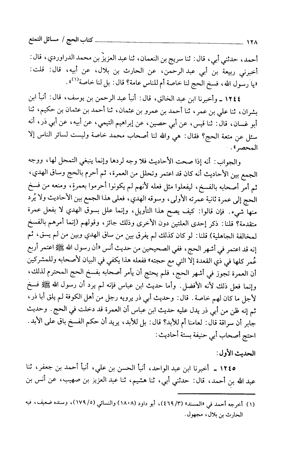 أَحْمد حَدثنِي أبي قَالَ ثَنَا سُرَيج بن النُّعْمَان ثَنَا عبد الْعَزِيز بن مُحَمَّد الداروردي قَالَ أَخْبَرَنِي رَبِيعَةُ بْنُ أَبِي عَبْدِ الرَّحْمَنِ عَنِ الْحَارِثِ بْنِ بِلَالٍ عَنْ أَبِيهِ قَالَ قُلْتُ يَا رَسُول الله فسخ الْحَجُّ لَنَا خَاصَّةً أَمْ لِلنَّاسِ عَامَةً قَالَ بَلْ لَنَا خَاصَةً