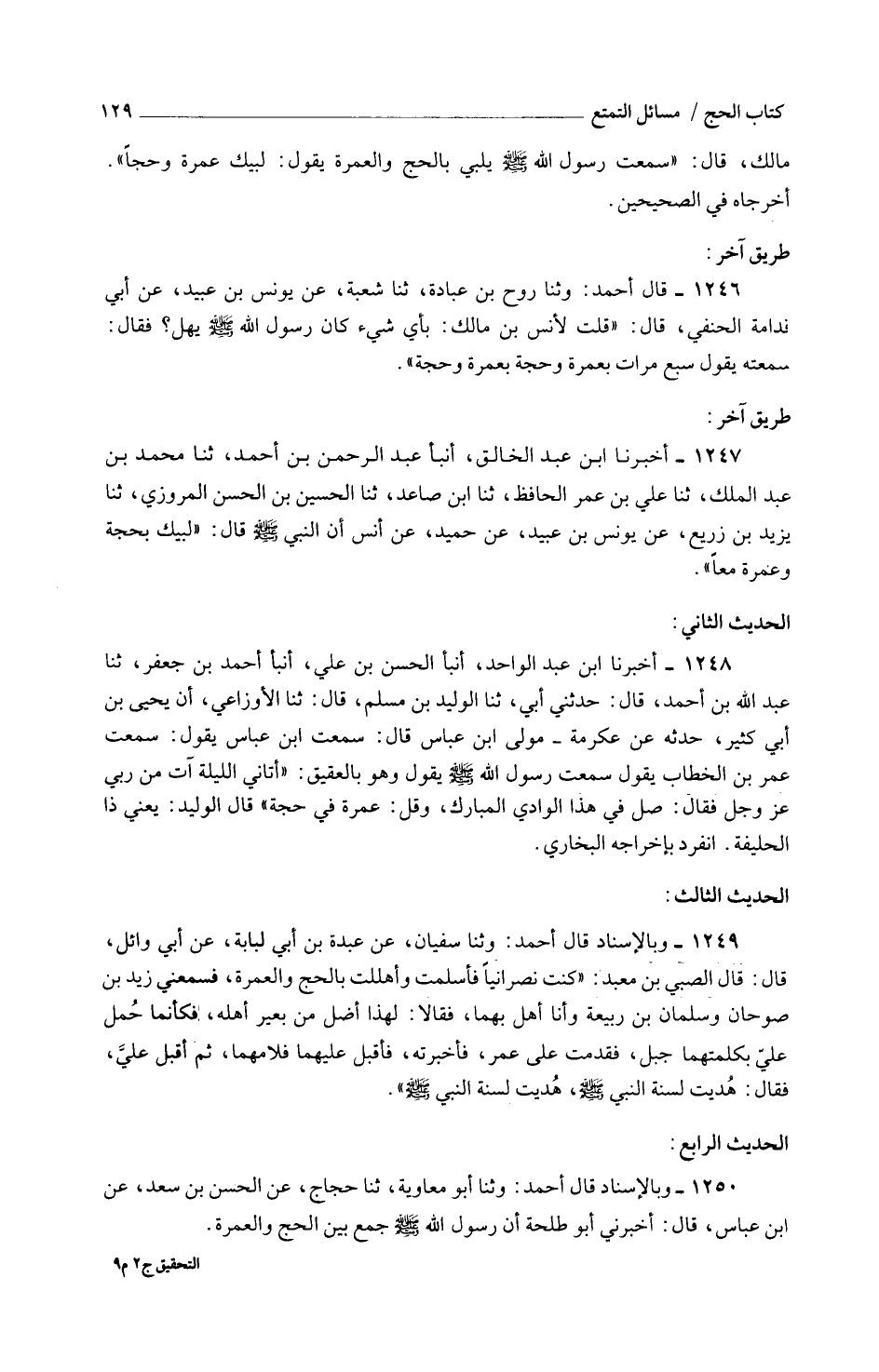 1246 - قَالَ أَحْمد وثنا روح بن عبَادَة ثَنَا شُعْبَةُ عَنْ يُونُسَ بْنِ عُبَيْدٍ عَنْ أَبِي قُدَامَةَ الْحَنَفِيِّ قَالَ قُلْتُ لِأَنَسِ بْنِ مَالِكٍ بِأَيِّ شَيْءٍ كَانَ رَسُولُ اللَّهِ صَلَّى اللَّهُ عَلَيْهِ وَسَلَّمَ يَهِلُّ فَقَالَ سمعته يَقُول سبع مَرَّات بِعُمْرَةٍ وَحَجَّةٍ بِعُمْرَةٍ وَحَجَّةٍ