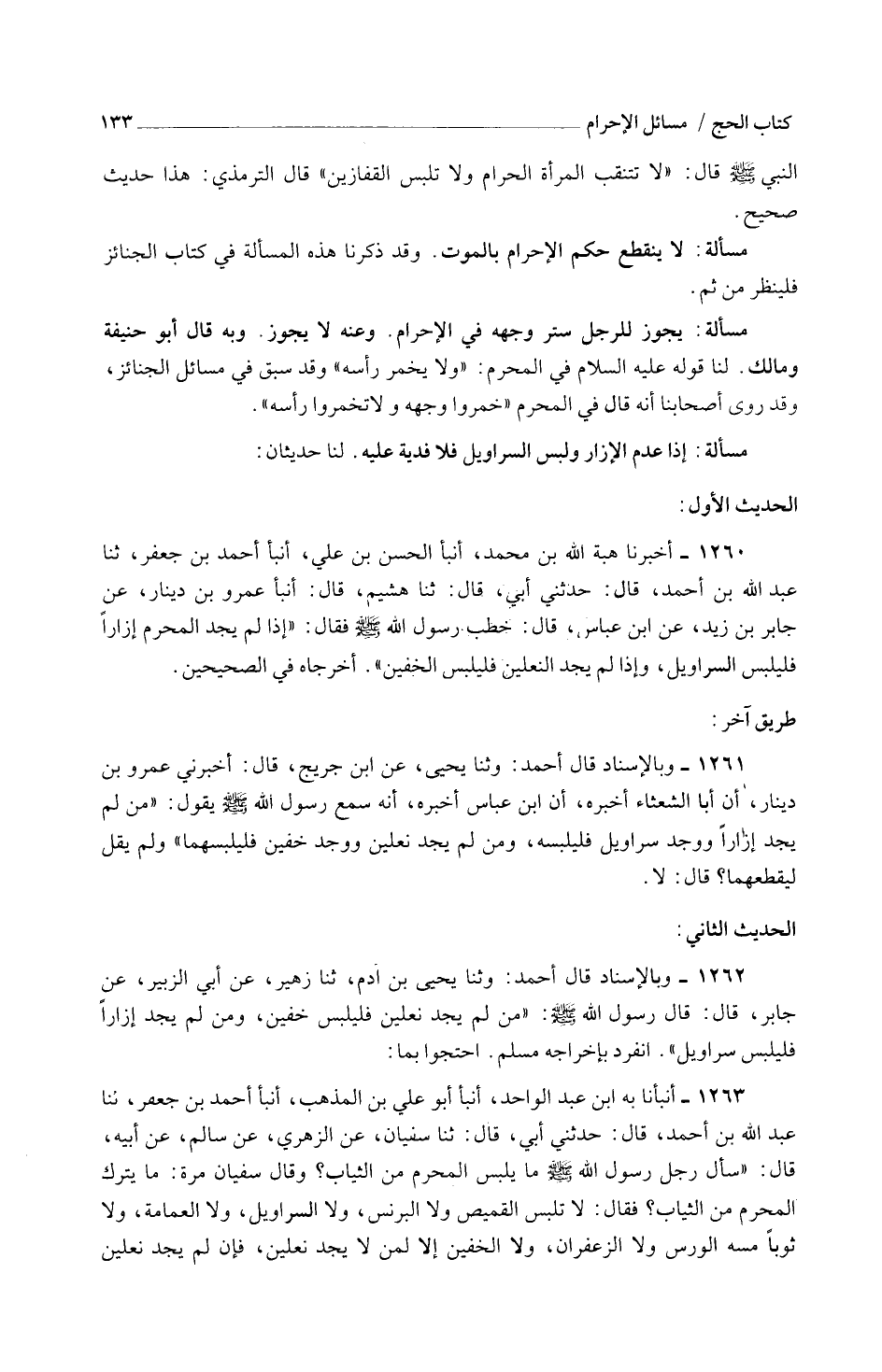 1263 - أَنْبَأَنَا بِهِ ابْن عبد الْوَاحِد أَنْبَأَ أَبُو عَلِيِّ بْنُ الْمُذْهِبُ أنبأ أَحْمد بن جَعْفَر ثَنَا عَبْدُ اللَّهِ بْنُ أَحْمَدَ قَالَ حَدثنِي أبي قَالَ ثَنَا سُفْيَانُ عَنِ الزُّهْرِيِّ عَنْ سَالِمٍ عَنْ أَبِيهِ قَالَ سَأَلَ رَجُلٌ رَسُولُ اللَّهِ صَلَّى اللَّهُ عَلَيْهِ وَسَلَّمَ مَا يَلْبَسِ الْمُحْرِمُ مِنَ الثِّيَابِ وَقَالَ سُفْيَانُ مَرَّةً مَا يَتْرُكُ الْمُحْرِمُ مِنَ الثِّيَابِ فَقَالَ لَا تلبس الْقَمِيصَ وَلَا الْبُرْنُسَ وَلَا السَّرَاوِيلَ وَلَا الْعِمَامَةَ وَلَا ثَوْبًا مَسَّهُ الْوَرْسُ وَلَا الزَّعْفَرَانُ وَلَا الْخُفَّيْنِ إِلَّا لِمَنْ لَا يَجِدُ نَعْلَيْنِ فَإِنْ لَمْ يَجِدْ نَعْلَيْنِ