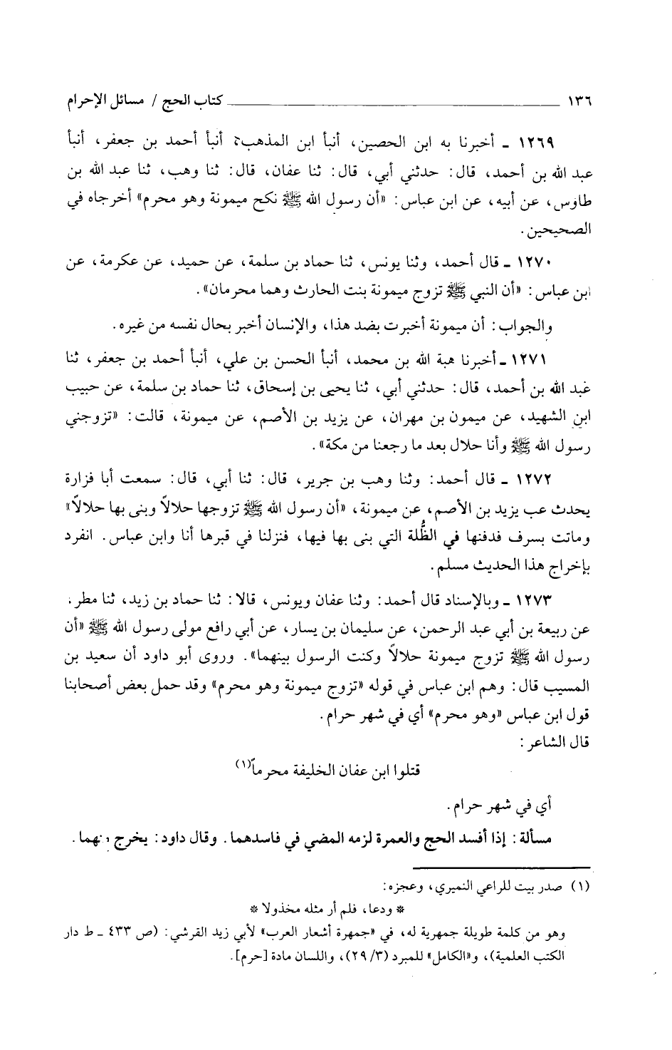 1269 - أَخْبَرَنَا بِهِ ابْنُ الْحُصَيْنِ أَنْبَأَ ابْنُ الْمُذْهِبِ أنَبْأَ أَحْمَدُ بْنُ جَعْفَرٍ أَنْبَأَ عَبْدُ اللَّهِ بْنُ أَحْمَدَ قَالَ حَدَّثَنِي أَبِي قَالَ ثَنَا عَفَّان قَالَ ثَنَا وهب ثَنَا عَبْدُ اللَّهِ بْنُ طَاوُسٍ عَنِ أَبِيهِ عَنِ ابْنِ عَبَّاسٍ أَنّ رَسُولُ اللَّهِ صَلَّى اللَّهُ عَلَيْهِ وَسَلَّمَ نَكَحَ مَيْمُونَةَ وَهُوَ مُحْرِمٌ أَخْرَجَاهُ فِي الصَّحِيحَيْنِ