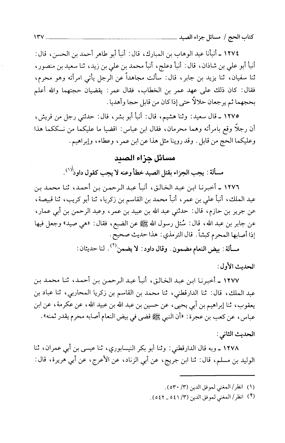 1274 - أَنْبَأَنَا عَبْدُ الْوَهَّابِ بْنُ الْمُبَارَكِ قَالَ أَنْبَأَ أَبُو طَاهِرٍ أَحْمَدُ بْنُ الْحسن قَالَ أَنْبَأَ أَبُو عَلِيِّ بْنِ شَاذَانَ قَالَ أَنْبَأَ دَعْلَجٌ أَنْبَأَ مُحَمَّدُ بْنُ عَليّ بن زيد ثَنَا سعيد بن مَنْصُور ثَنَا سُفْيَان ثَنَا يَزِيدُ بْنُ جَابِرٍ قَالَ سَأَلْتُ مُجَاهِدًا عَنِ الرَّجُلِ يَأْتِي امْرَأَتَهُ وَهُوَ مُحْرِمٌ فَقَالَ كَانَ ذَلِكَ عَلَى عَهْدِ عُمَرَ بْنِ الْخَطَّابِ فَقَالَ عمر يقضيان حجتهما وَاللَّهُ أَعْلَمُ بحَجِّهِما ثُمَّ يَرْجَعَانِ حَلَالًا حَتَّى إِذَا كَانَ مِنْ قَابِلٍ حَجَّا وَأَهْدَيَا
