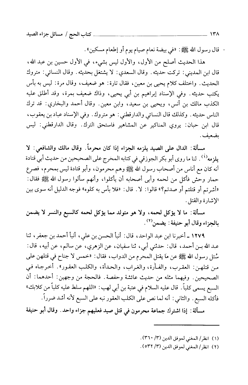 1279 - أَخْبَرَنَا ابْنُ عَبْدِ الْوَاحِدِ قَالَ أَنْبَأَ الْحَسَنُ بْنُ عَلِيٍّ أنبأ أَحْمد بن جَعْفَر ثَنَا عَبْدُ اللَّهِ بْنُ أَحْمَدَ قَالَ حَدثنِي أبي ثَنَا سُفْيَانُ عَنِ الزُّهْرِيِّ عَنْ سَالِمٍ عَنْ أَبِيهِ قَالَ سُئِلَ رَسُولُ اللَّهِ صَلَّى اللَّهُ عَلَيْهِ وَسَلَّمَ عَن مَا يَقْتُلُ الْمُحْرِمُ مِنَ الدَّوَابِ فَقَالَ خَمْسٌ لَا جَنَاحَ فِي قَتْلِهِنَّ عَلَى مَنْ قَتَلَهُنَّ الْعَقْرَبُ وَالْفَأْرَةُ وَالْغُرَابُ وَالْحِدَأَةُ وَالْكَلْبُ الْعَقُورُ أَخْرَجَاهُ فِي الصَّحِيحَيْنِ وَفِيهُمَا مِثَلُهُ مِنْ حَدِيثِ عَائِشَةَ وَحَفْصَةَ فَالْحُجَّةُ مِنْ وَجْهَيْنِ أَحَدِهِمَا أَنَّ السَّبْعَ يُسَمَّى كَلْبًا قَالَ عَلَيْهِ السَّلَامُ فِي عُتْبَةَ بْنِ أَبِي لَهَبٍ اللَّهُمَّ سَلِّطْ عَلَيْهِ كَلْبًا مِنْ كِلَابِكَ فَأَكَلَهُ السَّبُعُ وَالثَّانِي أَنَّهُ لَمَّا نَص على الْكَلْب الْعَقُور نبه على السَّبع لِأَنَّهُ أَشد ضَرَرا